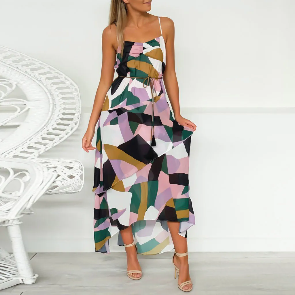 Модное женское асимметричное женское платье с многослойным поясом и принтом