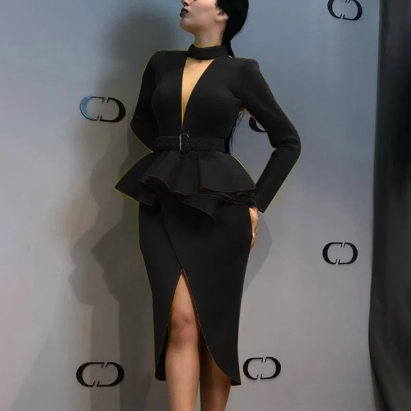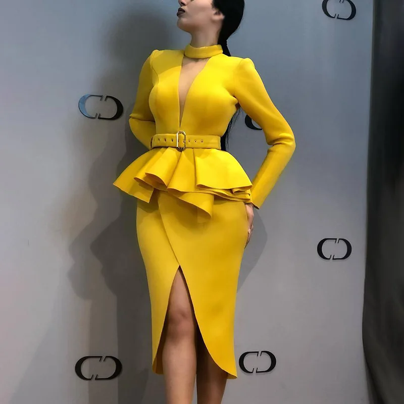 * Описание товара:Длинный рукав, сексуальный, v-образный вырез, молния, Falbala, бодикон, Коктейльные Вечерние платья