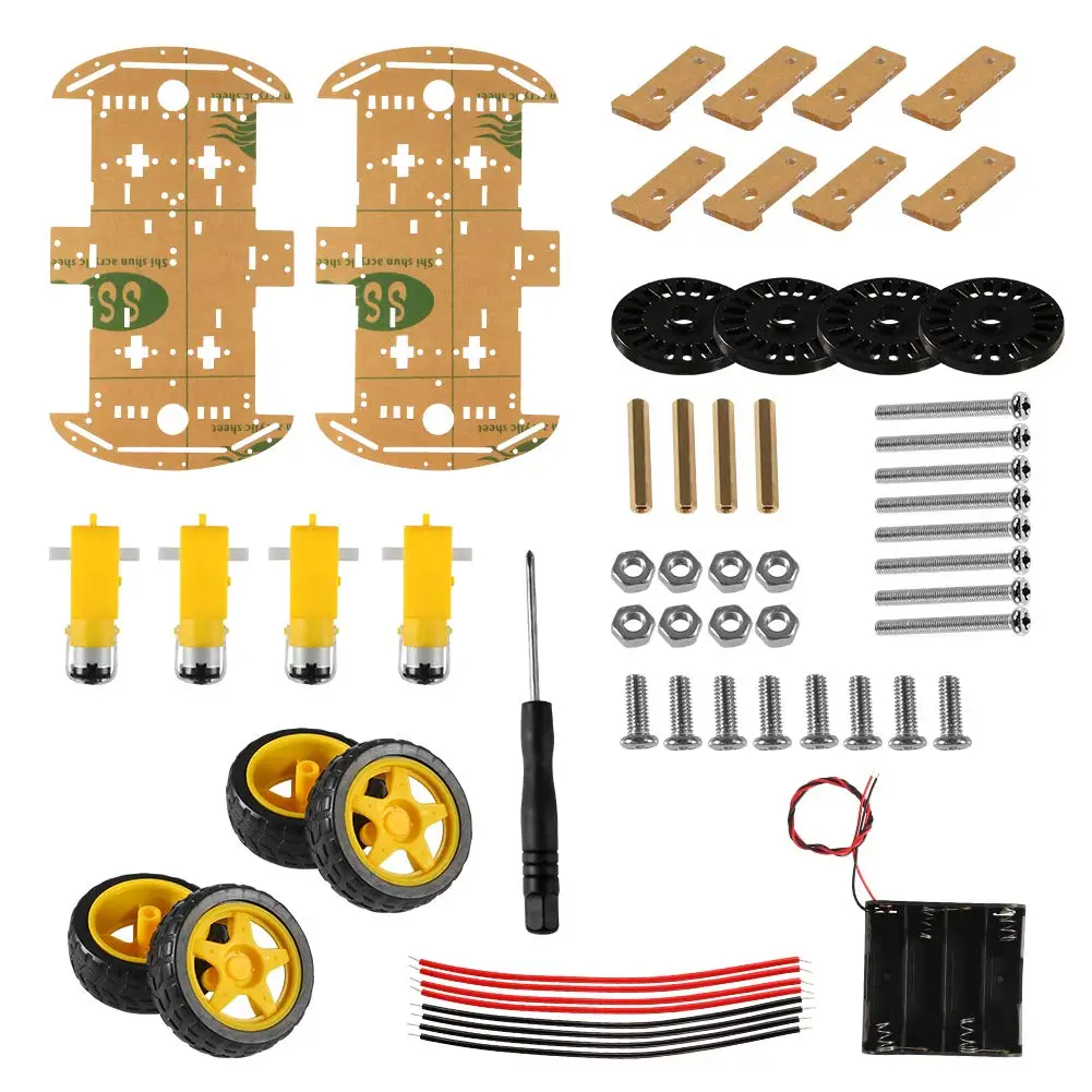 1 x шасси автомобиля 4 x мотор-редуктор (1:48) 4 x автомобильные шины 4 x кодировщик скорости 8 x крепеж 1 х батарейный блок (батарейки в комплект не входят) 1 отвертка Все необходимые винты и гайки.