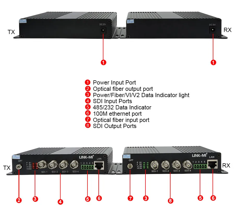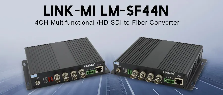 LINK-MI LM-SF44N The multifunctional 4CH HD-SDI To Fiber converter also named as 4CH SDI fiber multiplexer or 4 port sdi fiber optic extender, which consists of 1 piece of SDI fiber transmitter and 1 piece of SDI receiver .It transmits 4CH Unidirectional 3G/HDSDI signals (also compatible ASI,and each SDI signal includes 1 embedded audio signal)and 1ch bidirectional analog audio,1ch 10/100M ethernet,1ch bidirectional RS485/ RS232 to a long distance over one fiber. It's a popular product widely used in TV live broadcast, high-definition video conferencing, video surveillance and other fields.