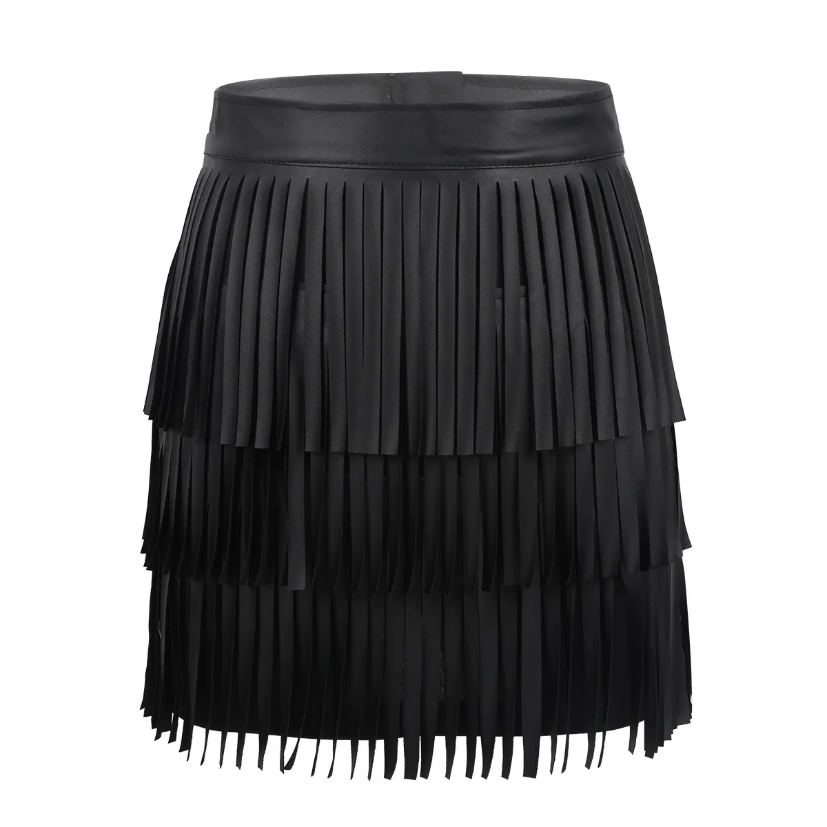 Мини-юбка из искусственной кожи с кисточками и мягкой тканью, очень удобная в носке, легко сочетается с топами и футболками.