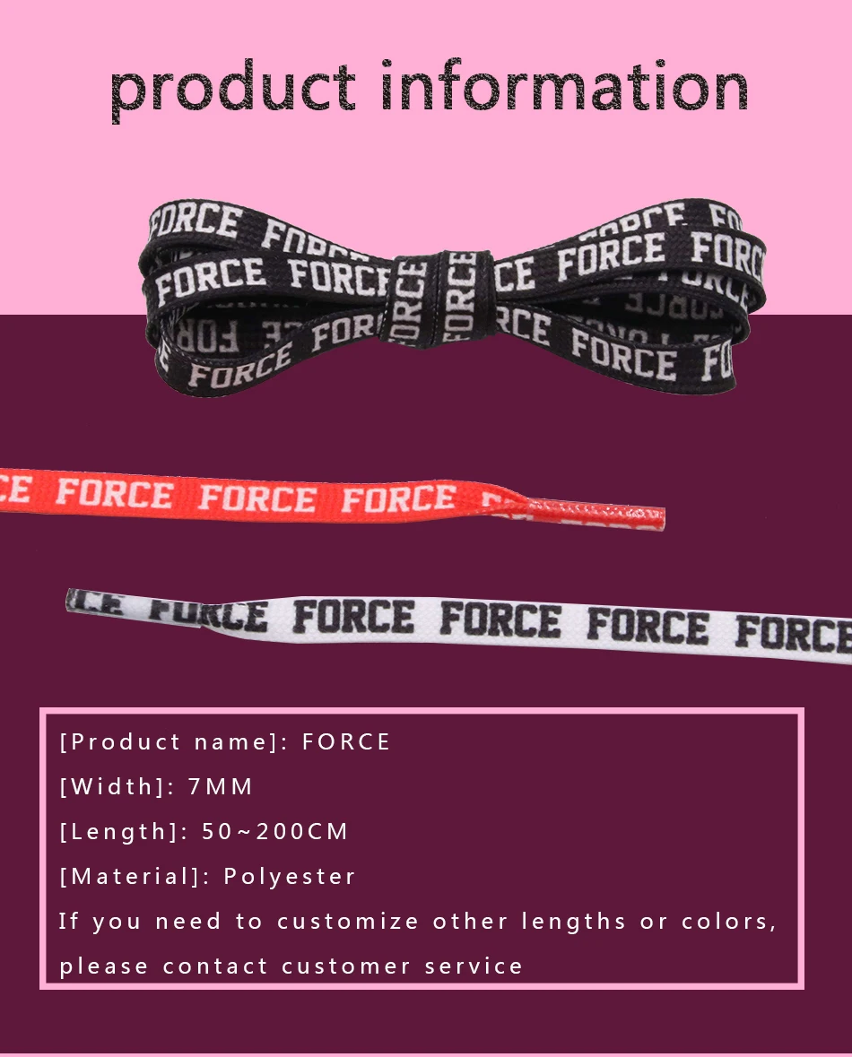 Материал: двухслойный полиэфирный хлопок + пластик Функция/сочетание/Применение: шнурки для обуви, шнурки для талии, веревки для шляпы и т. д. Цвет/разноцветная комбинация: принт с надписью «FORCE», красный/черный/белый 3 цвета на выбор Спецификация: 50-200 см * 7 мм Диаметр/Ширина: 0,7 см Тип формы: плоский Головка шнурков: прозрачный пластик Вес брутто: 40 г Сертификат: Oeko-tex-100,ISO9001,SGS,CE Посылка: 1 пара/opp полиэтиленовый пакет Индивидуальные: цветовое сочетание/длина и ширина/печать логотипа, пожалуйста, свяжитесь с нашей службой поддержки клиентов