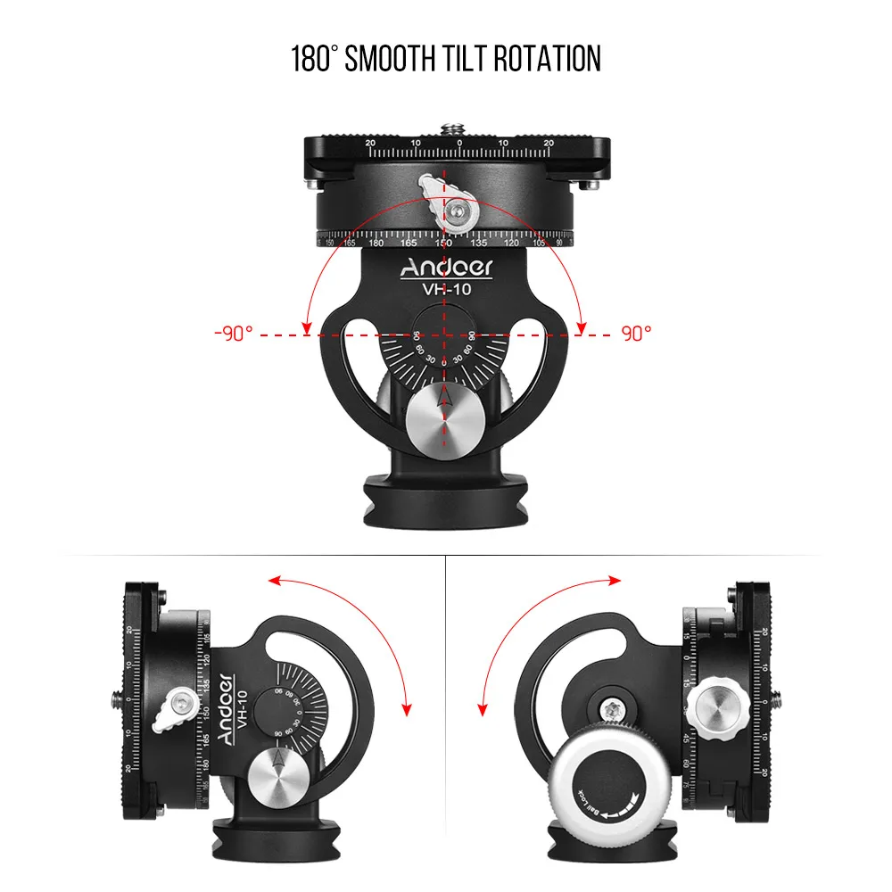 Головка штатива Andoer VH-10 из алюминиевого сплава является отличным помощником для панорамной съемки, а также наблюдения за птицами. Он поддерживает панорамирование 360 ° и движение наклона +/-90 °. Процесс очень гладкий.