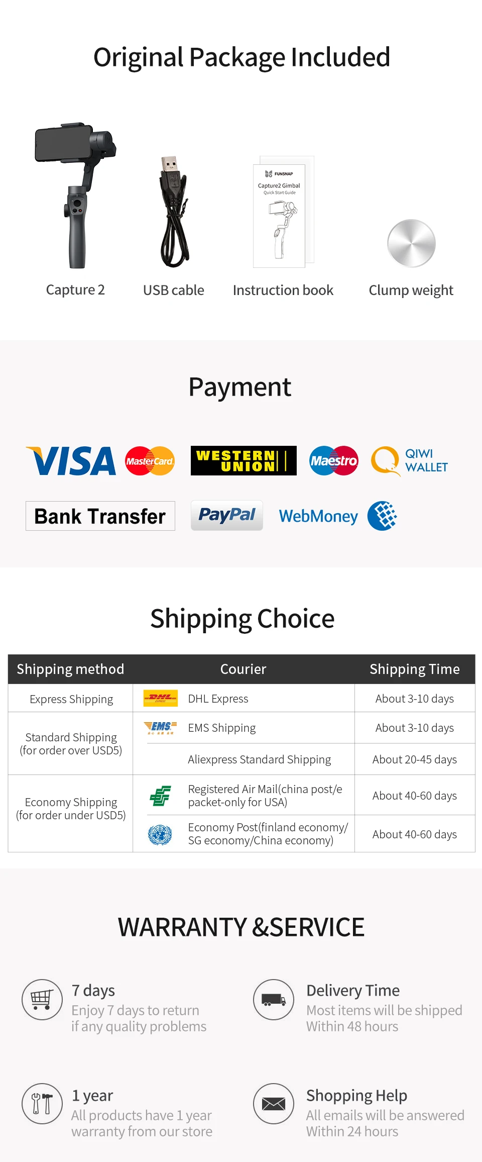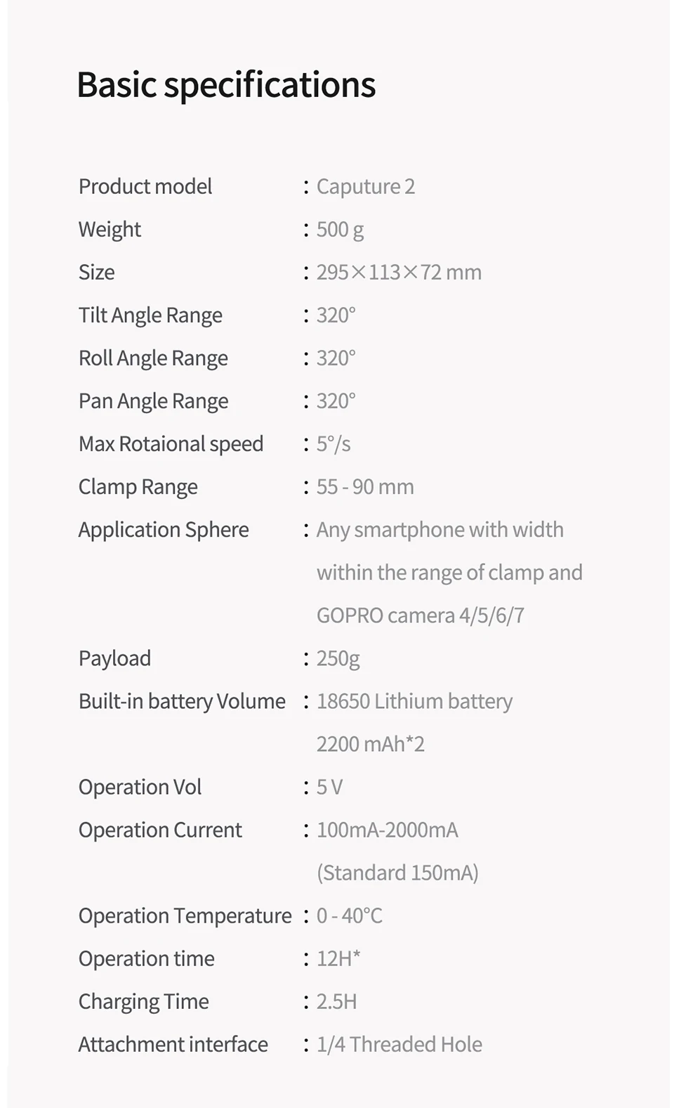 Если вы не знаете, как его использовать, пожалуйста, свяжитесь с нами, прежде чем открывать спор! • 3-осевой ручной стабилизирующий смартфона Gimbal * Размер: 320*125*43 мм * Материал: Высокопрочный нейлон + стекловолокно • Вес: 500 г • Угол обзора: панорамирование 320 °, наклон 320 °, поворот 320 ° • Максимальная скорость вращения: 5 °/С • Полезная нагрузка: 250 г • Встроенный аккумулятор: 2200 мАч * 2 (литиевая батарея) • Входное напряжение: макс. 5 В/2 А; Рабочая мощность: 5 В/0,15 А • Время работы: 12 часов • Время зарядки: 2,5 часов • Диапазон зажимов 58,6-92 мм • Гладкая масштабирование • Режим FPV • Режим PhoneGo • Time-Lapse Expert:Time Lapse,Motion Lapse, Hyper Lapse • Отслеживание лиц и отслеживание объектов • Экшн-Камера Режим • Режим панорамы: 320 °,180 °, панорама с девятью сетками • Одноклавишное направление Swift • Красота съемки • Ретуширование и фильтры для селфи • Калибровка в приложении • Идеально совместим с серией GoPro Hero и различными видами экшн-камер аналогичного размера или веса • совместим с iOS и Android Поддержка iOS 9,0 и более поздней версии, Android 5,0 и более поздней версии