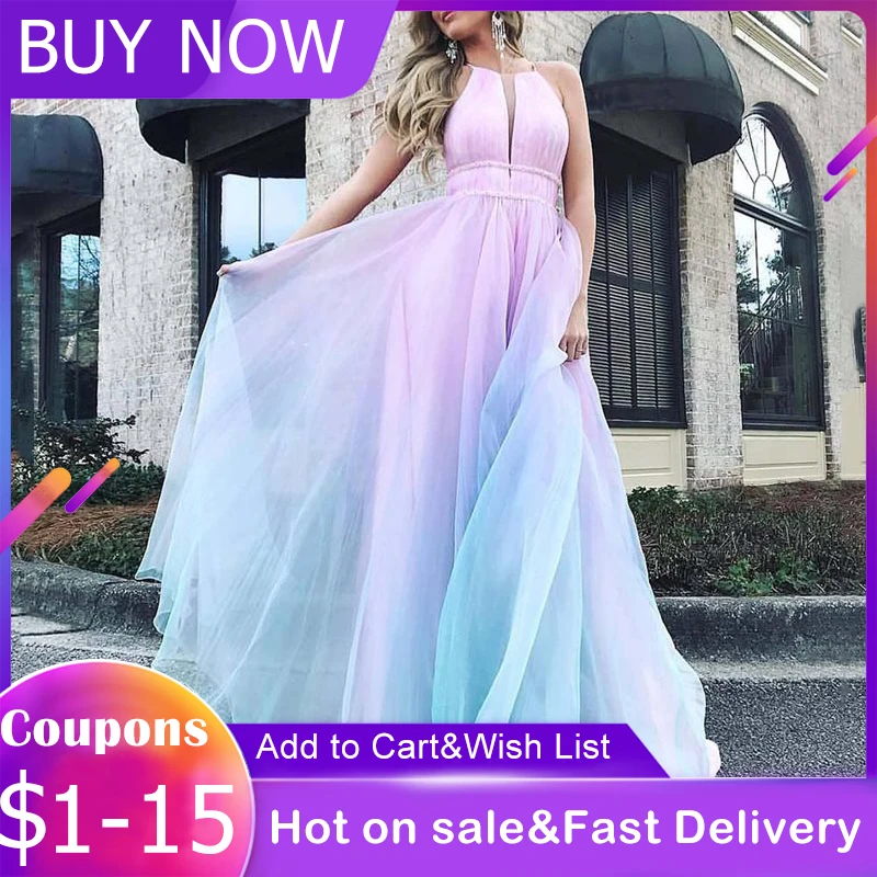 Vestido de fiesta largo rosa y azul de princesa, sin mangas, con cuello Halter, cintura alta, elegante, de boda, para verano