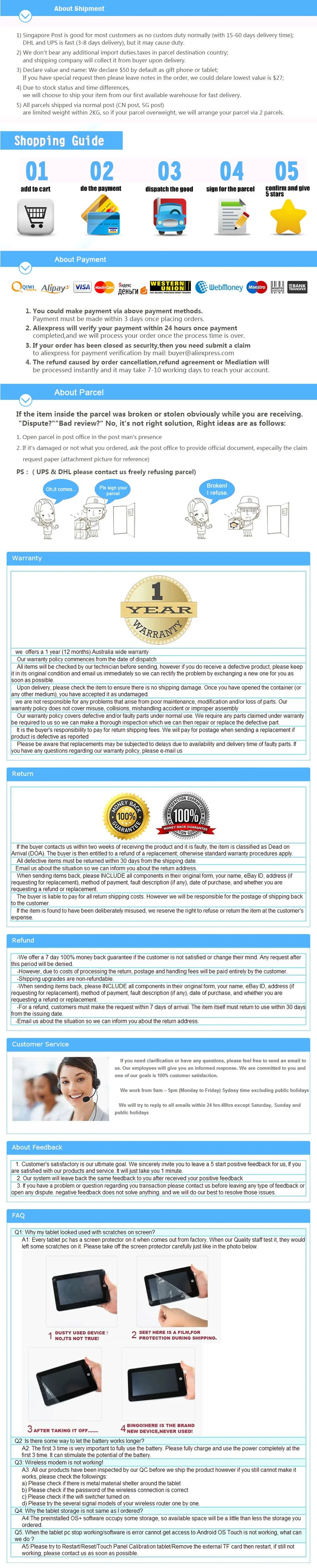 Соответствующий вопрос для S119Вопрос 1: Как насчет планшетного ПК S119?Ответ: это сертифицированные FCC и CCC и CE все спецификации являются точными и правильными.Вопрос 2: почему экран S119 такой красивый (смотрите видео)?Ответ: экран S119-это супер IPS 2.5D экран, этот экран более красивый, чем обычный экран. И не легко сломать.Вопрос 3: почему S119 так быстро (смотрите видео)?Ответ: новый дизайн, сочетающий ОЗУ и ПЗУ, а также Восьмиядерный процессор MTK6753 (Cortex-A53 Восьмиядерный процессор) и Mali-T720MP GPU, более быстрый, который работает в большом пространстве памяти. Таким образом, он более быстрый, чем обычный планшет.Вопрос 4: Что насчет доставки?Ответ: Пожалуйста, выберите стандартную доставку AliExpress, она более эффективная, более безопасная и удобная.Вопрос 5: Безопасность батареи S119?Ответ: Да. Это безопасность. Сертификат MSDS, пожалуйста, ознакомьтесь с описанием.ДисплейРазмер дисплея: 10 дюймов (длина экрана)