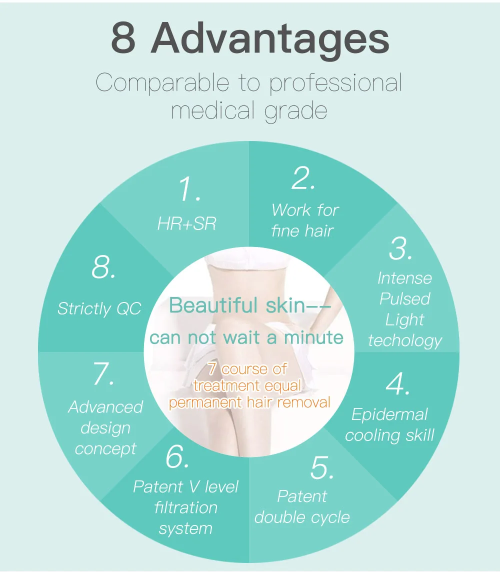 Как это работает? С селективным пиролизом и принципом теплового эффекта, IPL интенсивный импульсный светильник производит высокую интенсивность вспышки фильтрованного светильник от головки аппликатора, который был расположен в контакте с кожей. Источник энергии на светильник поглощается пигментным меланином, который является хромофором, придающим волосам свой цвет. Волосы быстро поглощают этот фильтрованный светильник и переносят его в окружающие клетки, которые в свою очередь преобразуются в тепло. Нагревание обозначает клетки, что делает их не способными производить дальнейший рост волос. Технические характеристики: Режим работы: режим HR (удаление волос), режим SR (Омоложение кожи) Рабочий фонарь с ручкой Тип: два, один для удаления волос, один для омоложения кожи Спектральный диапазон: широкий спектр Спектральная область: 530nm ~ 1100nm (SR) / 650nm ~ 1100nm (HR) Рабочая область головки: 4,4 см * 1,6 см Плотность энергии: 0 ~ 7J/см2 Импульсный номер: 2 (HR) / 5 (SR) Диапазон уровня: 1 ~ 10, шаг 1 Источник питания: 100 В-240 В переменного тока, 50 Гц/60 Гц в Номинальная входная мощность: 150 Вт Преимущества: Неинвазивный, без хирургии, Отсутствие боли, легкое жжение при обработке Это не повлияет на нормальную работу и жизнь после лечения Отсутствие побочных эффектов Продолжительный эффект Посылка включает в себя: 1x хост-машина и ручка 1x Управление руководство компакт-диска 1x Мощность кабель 1x лазерный очки устойчивые к ультрафиолетовому излучению