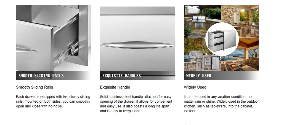 【Конструкция коробки 】-Ящики из нержавеющей стали для наружных кухонь предназначены для стиля коробки с полностью закрытой коробкой, эффективно предотвращает внутренние стороны от дождя, ветра, пыли и насекомых.