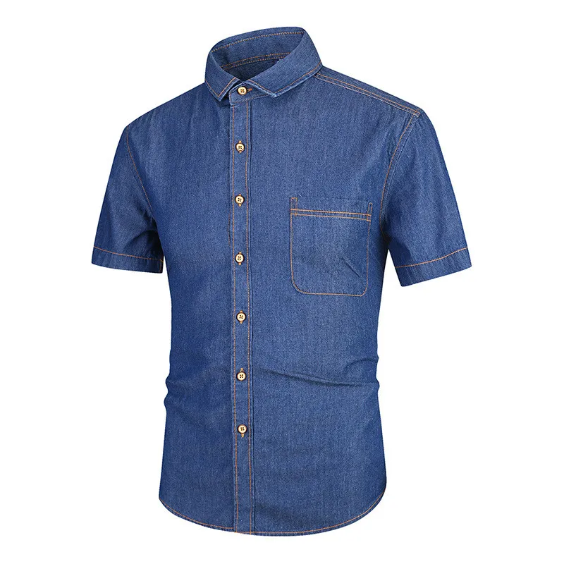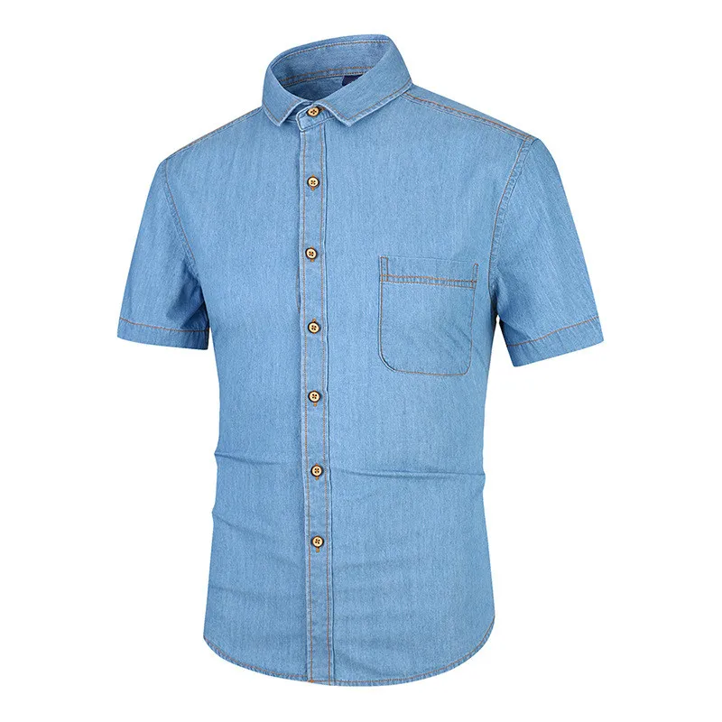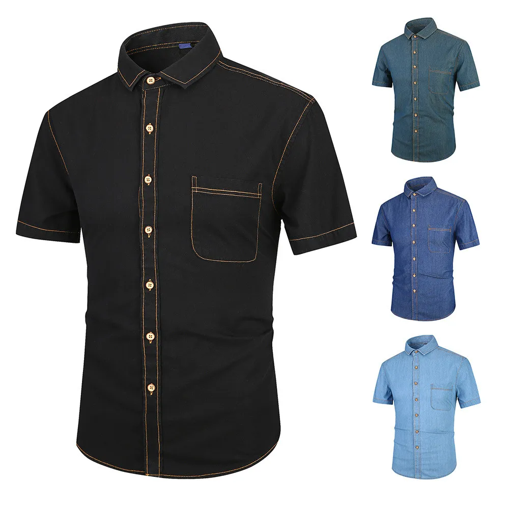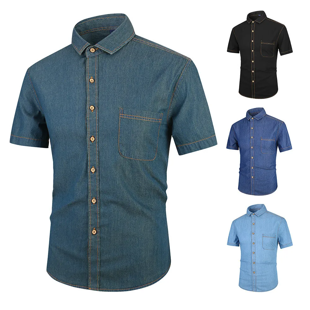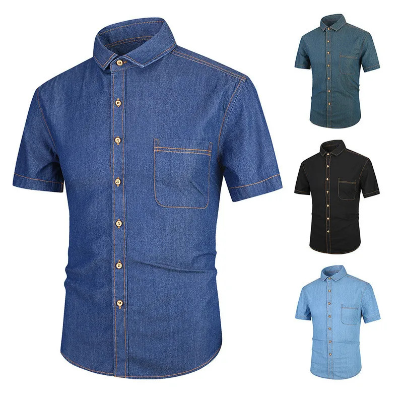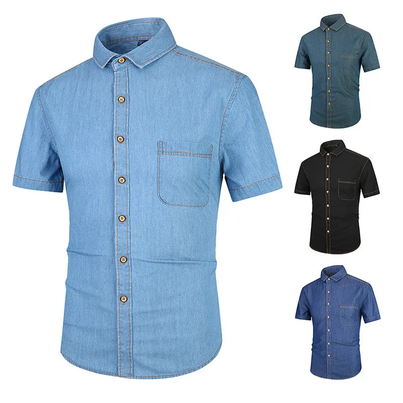 Summer Japanese Style Short Sleeve Cotton Denim Men Shirt Thin Slim Fit Casual Male Button Black Shirts Boys Tops Oversized 4xl Мужская - купить