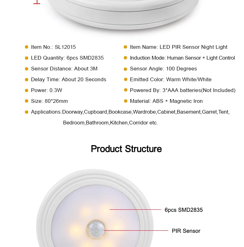 Гарантия: 1 год Особенности: 1. Встроенные 6 светодиодный ных ламп, супер яркая, долгий срок службы, автоматическое обнаружение, обнаружение человека, энергосбережение, светильник, когда свет тусклый. Люди автоматически выключаются, когда уходят. 2. Высококачественные материалы, элегантный и умный дизайн. Подходит для внутреннего использования, например, в спальнях, шкафах, шкафах, подвалах и т. д. закрепите светильник датчика тела с помощью двустороннего скотча и магнита. 3. Обеспечьте достаточно светильник, чтобы вы никогда не спотыкались в темноте, избавляя вас от включения верхсветильник льников, которые мешают спальному местам. 4. Круглые и компактные светильники станут маленьким украшением вашего дома. Идеально подходит для прихожей, дорожки, коридора, входа в дом, подвала. 5. Высококачественные датчики гарантируют, что этот эффективный светильник активируется только в темноте. Примечания: 1. Возможны отклонения в 1-3 см из-за ручного измерения и 3-5g из-за разницы между цветами. 2. Из-за разницы в мониторах цвет может немного отличаться от ожидаемого, пожалуйста, учитывайте это. Посылка: 1 светодиодный ночсветильник с PIR датчиком движения
