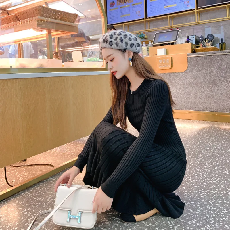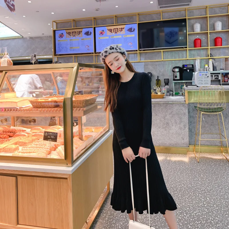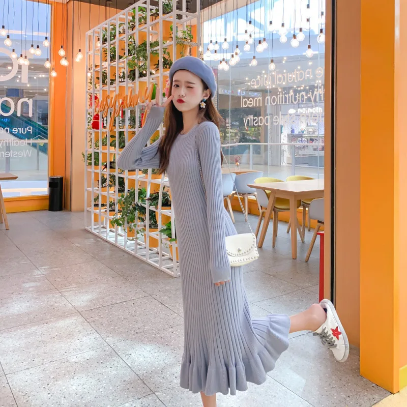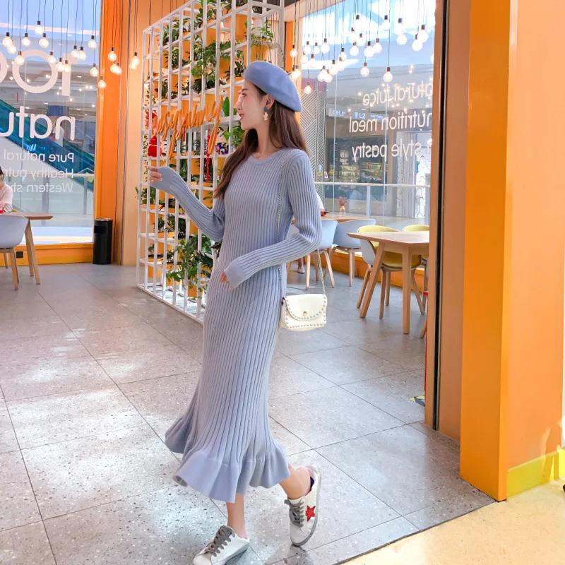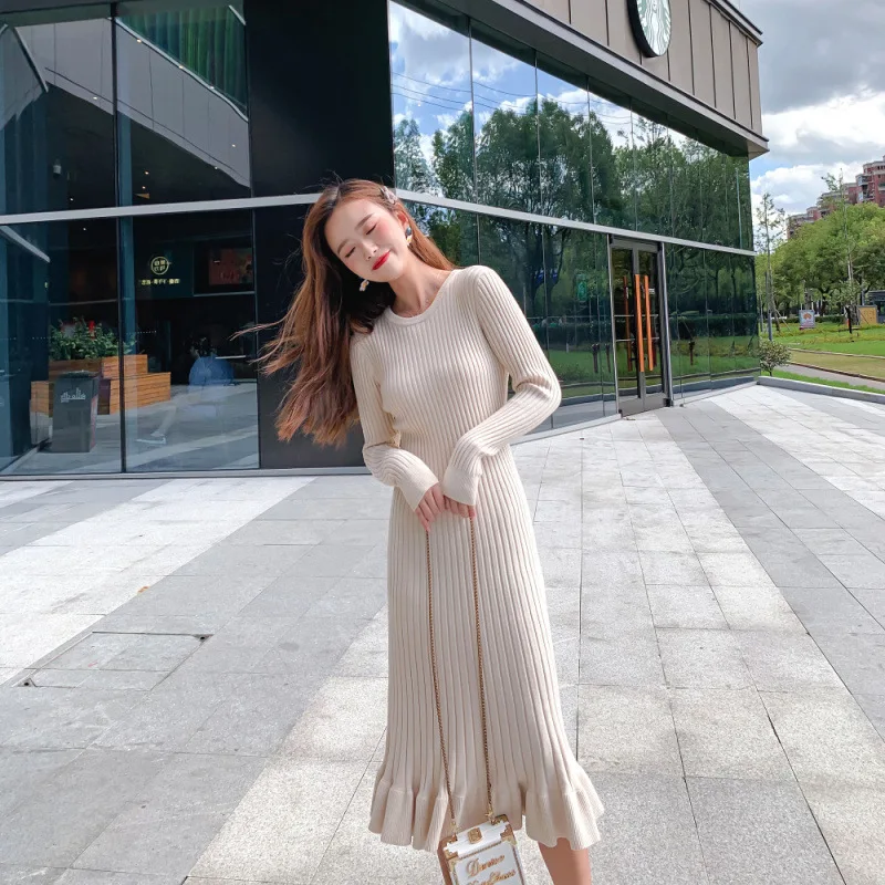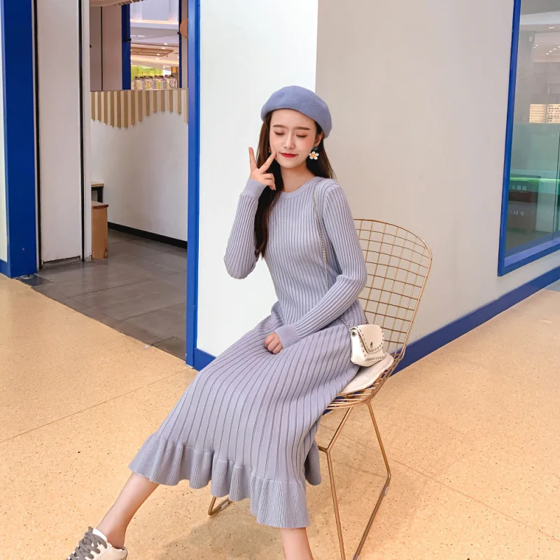 Осень-зима 2019, женское Элегантное Длинное платье-свитер с круглым вырезом, Женский трикотажный свитер, юбка, тонкое однотонное длинное платье-свитер