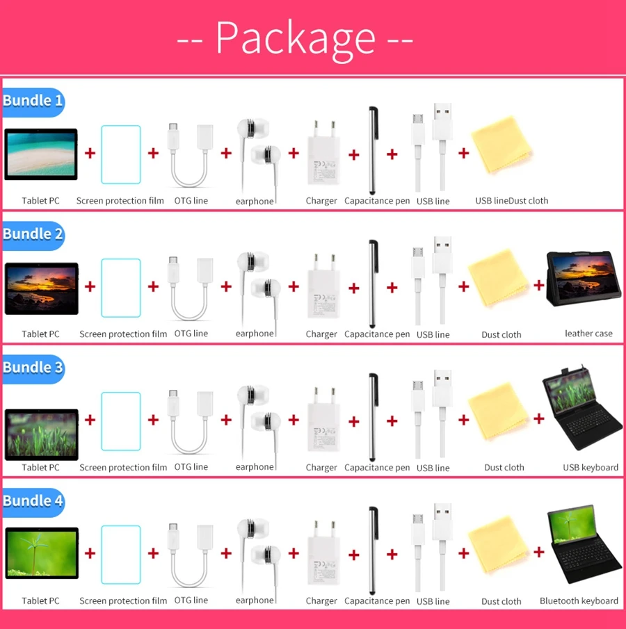 Комплект 4: (Восьмиядерный 10,1 дюйма 64 Гб ROM ) Bluetooth-клавиатура+ Линия USB + линия OTG + Защитная пленка для экрана + емкостная ручка + зарядное устройство + руководство + гарантийный талон + подарочная коробка