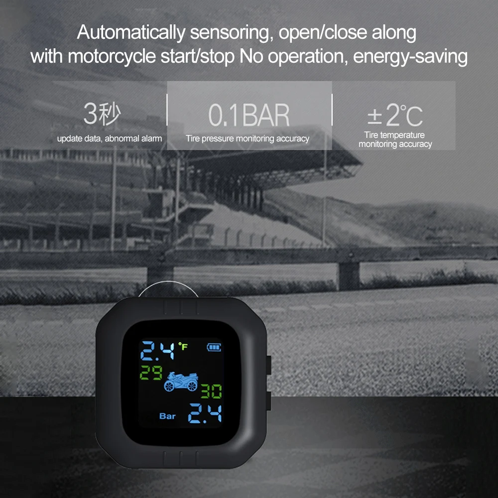 Система контроля давления в шинах обеспечивает мониторинг данных в реальном времени и аномальное оповещение, датчик codeless для получения, сильная способность анти-интерференции. Это практично и безопасно для езды на мотоцикле.