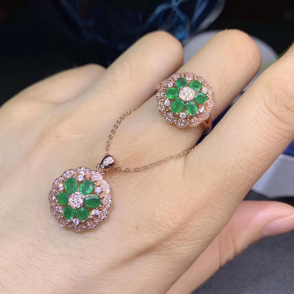 Новый стиль зеленый натуральный изумруд драгоценный камень кольцо и ожерелье ювелирный набор с 925 серебро prmotion цена