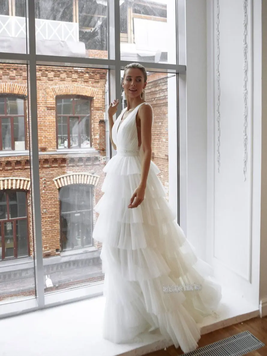 Купить Tulle Princess Bride For Women Sleeveless Lace Wedding Dress 2022 Sexy V Neck Backless Robe De Mariee Tiered A-Line | Свадьбы и