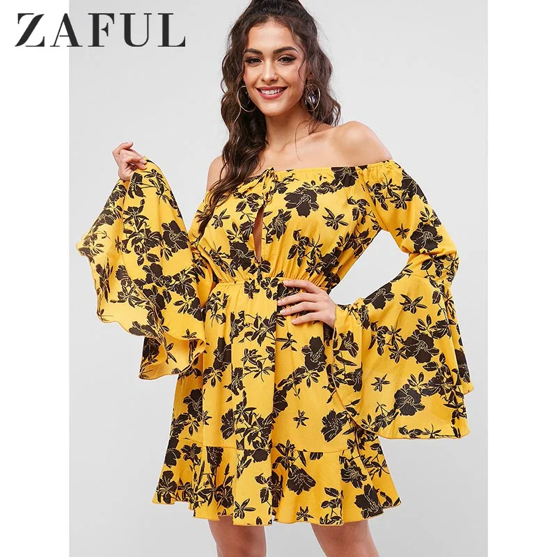 Купить ZAFUL Floral Sleeve Lantern Vacation Beach Sling Flounce Off Shoulder Organza Dress Sexy Evening Party Bodycon Wholesale | Женская
