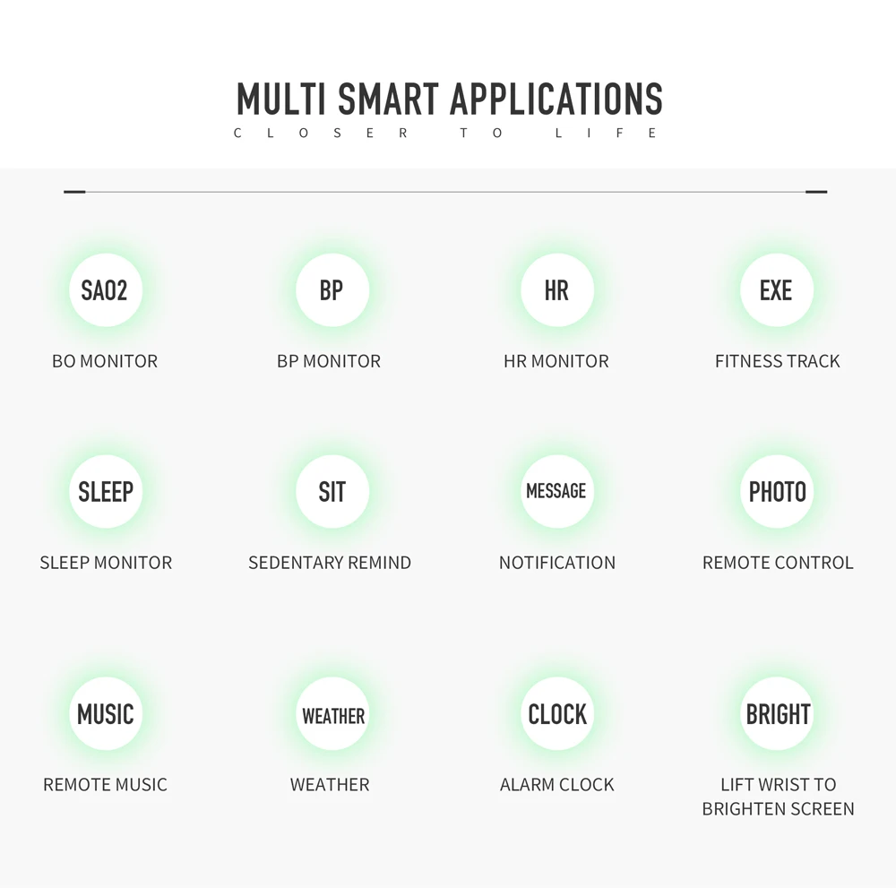 Особенности: * Платформа HS6620D, * 1,3 "дюймовый Разрешение 240*240 IPS цветной экран * Срок службы водонепроницаемый (вы можете носить его, чтобы мыть руки, но не плавать, Не помещайте его в горячую воду) * Встроенный полимерный аккумулятор 140 мАч * Обнаружение кровяного давления и кислорода в крови * Bluetooth Push: поддержка (звонящий, SMS мессенджер, напоминания о новостях приложения) * Шагомер: поддержка (шаг упражнений, расход калорий, запись пробега движения) * Мульти спортивный режим: ходьба, бег, езда, бадминтон, баскетбол, футбол, скакалка * Название приложения: «DaFit», вы можете загрузить его в google play или APP store * BT4.0, Совместимая система Android 4,4 и IOS 9,0 и выше * Дополнительные функции: управление музыкой, запись движения (шаг, пробег), мониторинг сна, напоминание о сидячем положении, расчет калорий, секундомер, оповещение о низком заряде батареи, повышение яркости экрана, быстрая зарядка, низкое энергопотребление, вибрация, режим упражнений, удаленная камера, интеллектуальная сигнализация