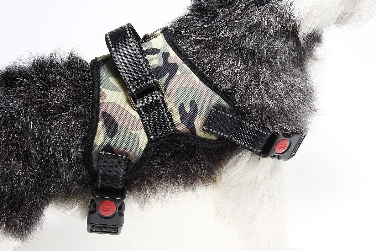 Два Быстрый выпустила пряжки, один из них-вокруг шеи и других вокруг груди, которая позволяет легко надевать и снимать, не повредить кожу собаки и мех.