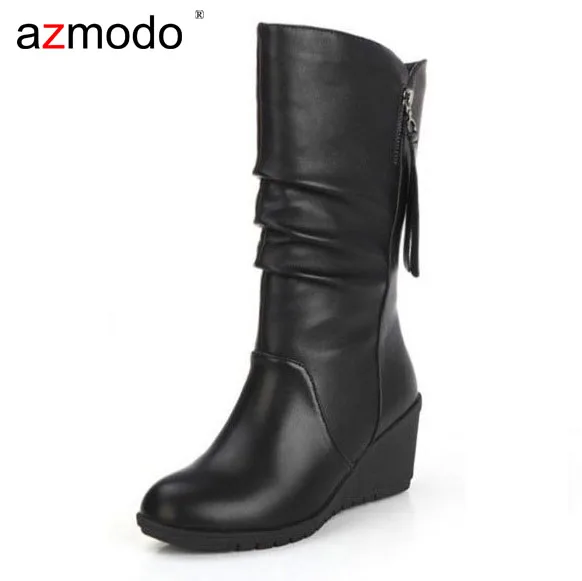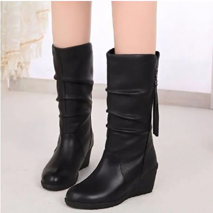 Отзывы о Женские ботинки до середины икры на танкетке женская обувь модная черная для мам