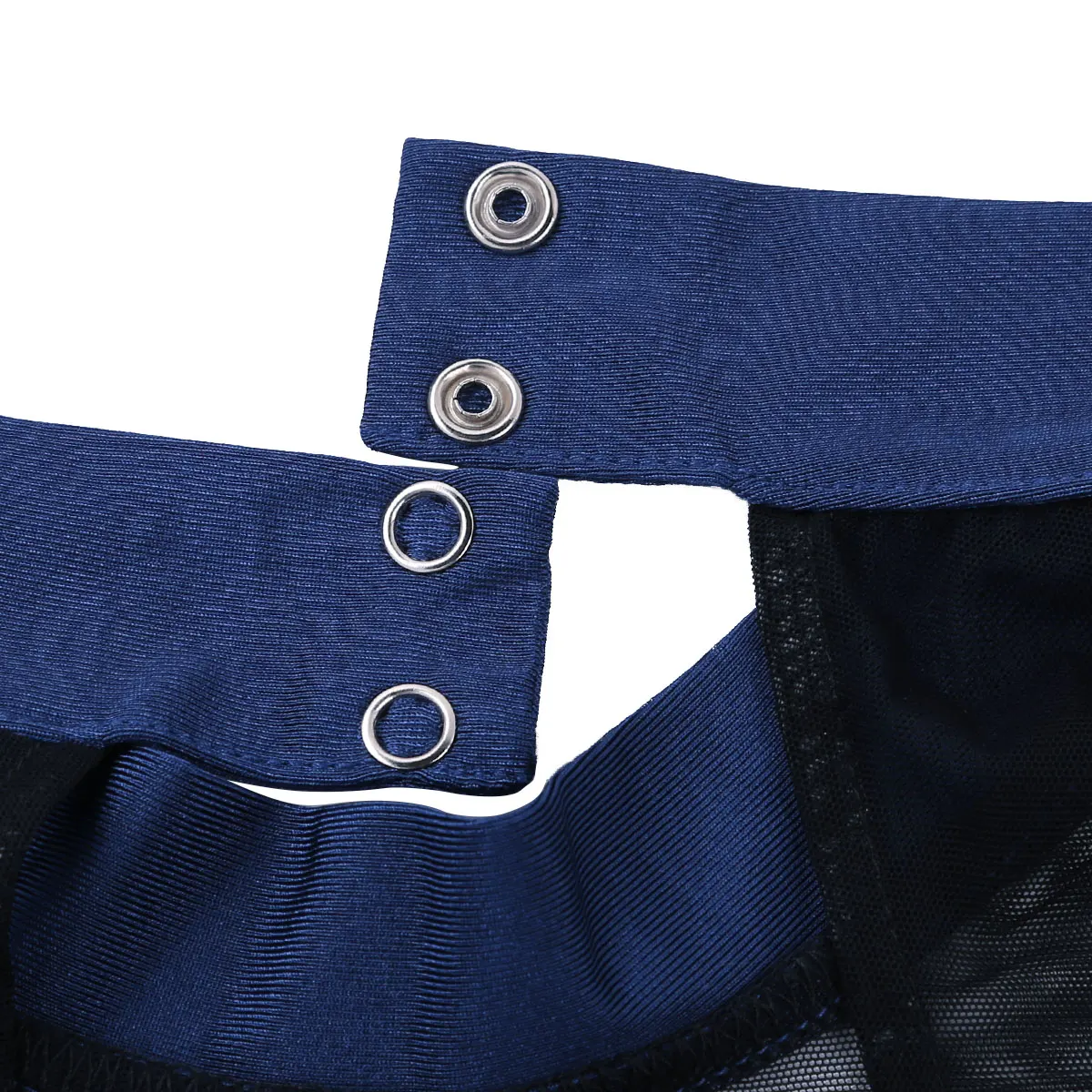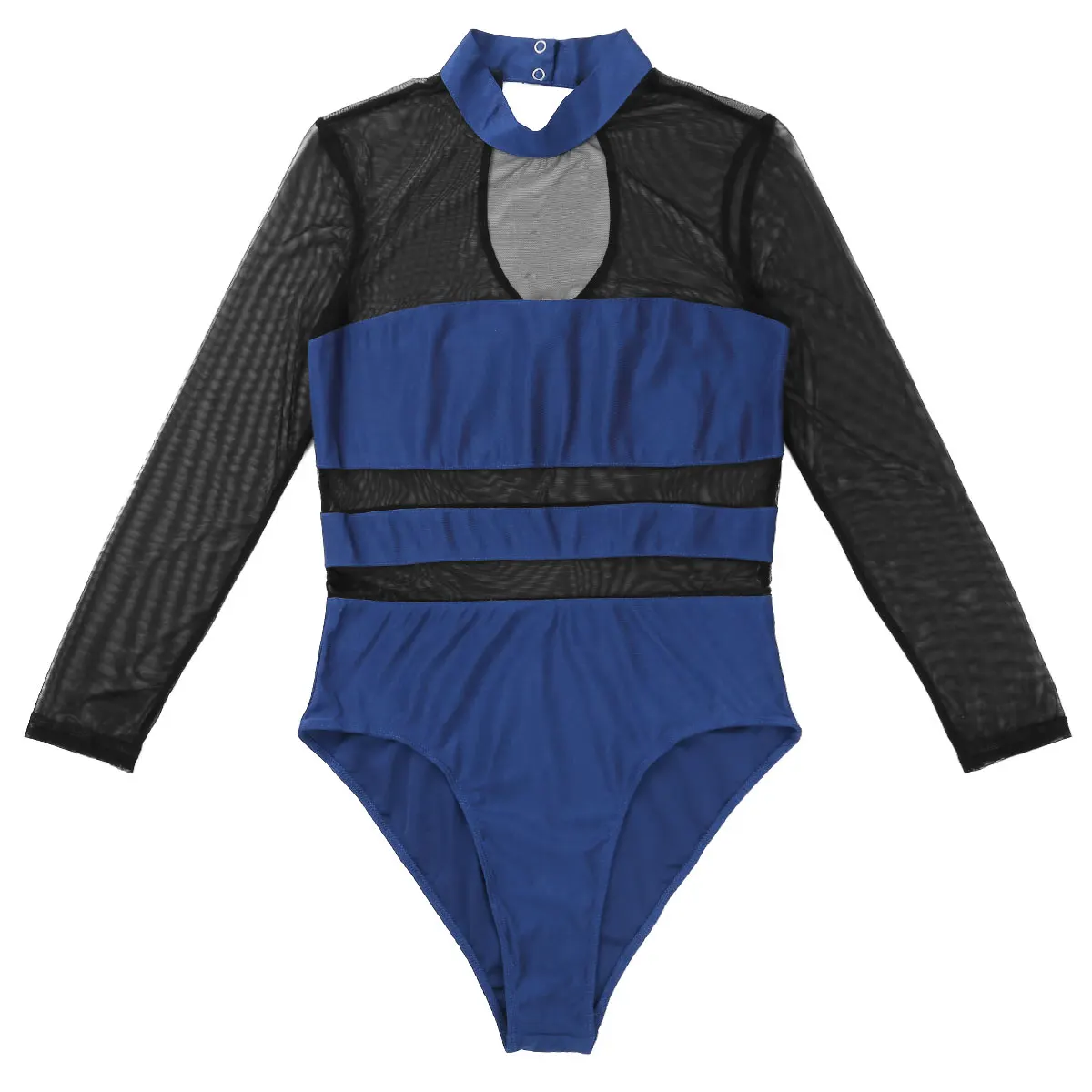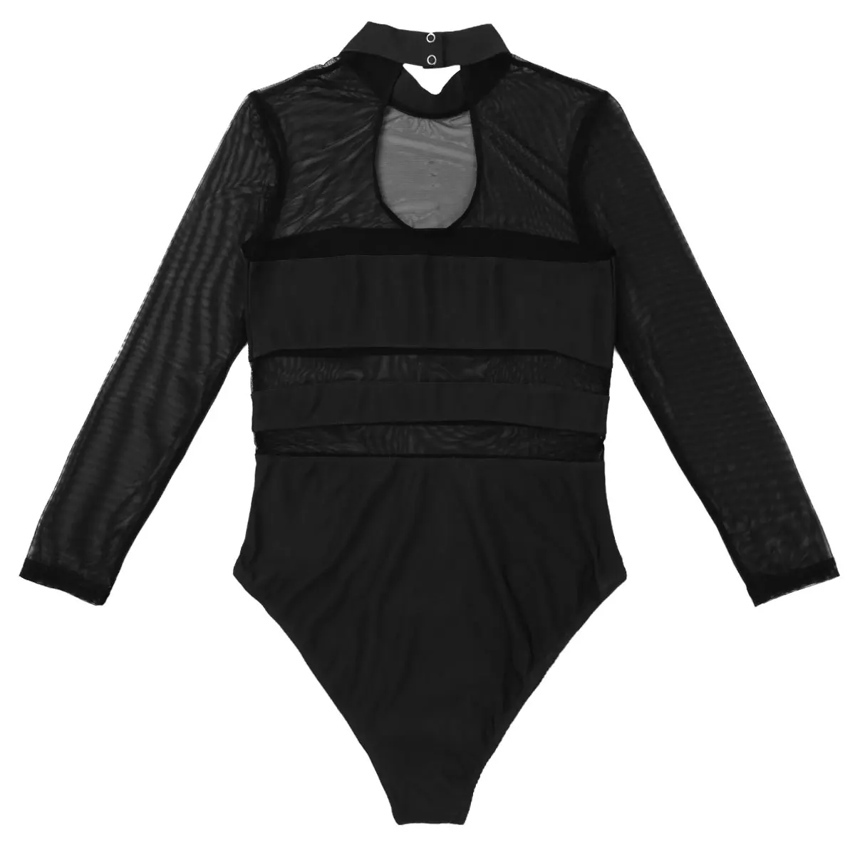Воротник-хомут с пуговицей, вырез-капля сзади и длинные рукава, сетчатый дизайн, высокий вырез на штанинах.
