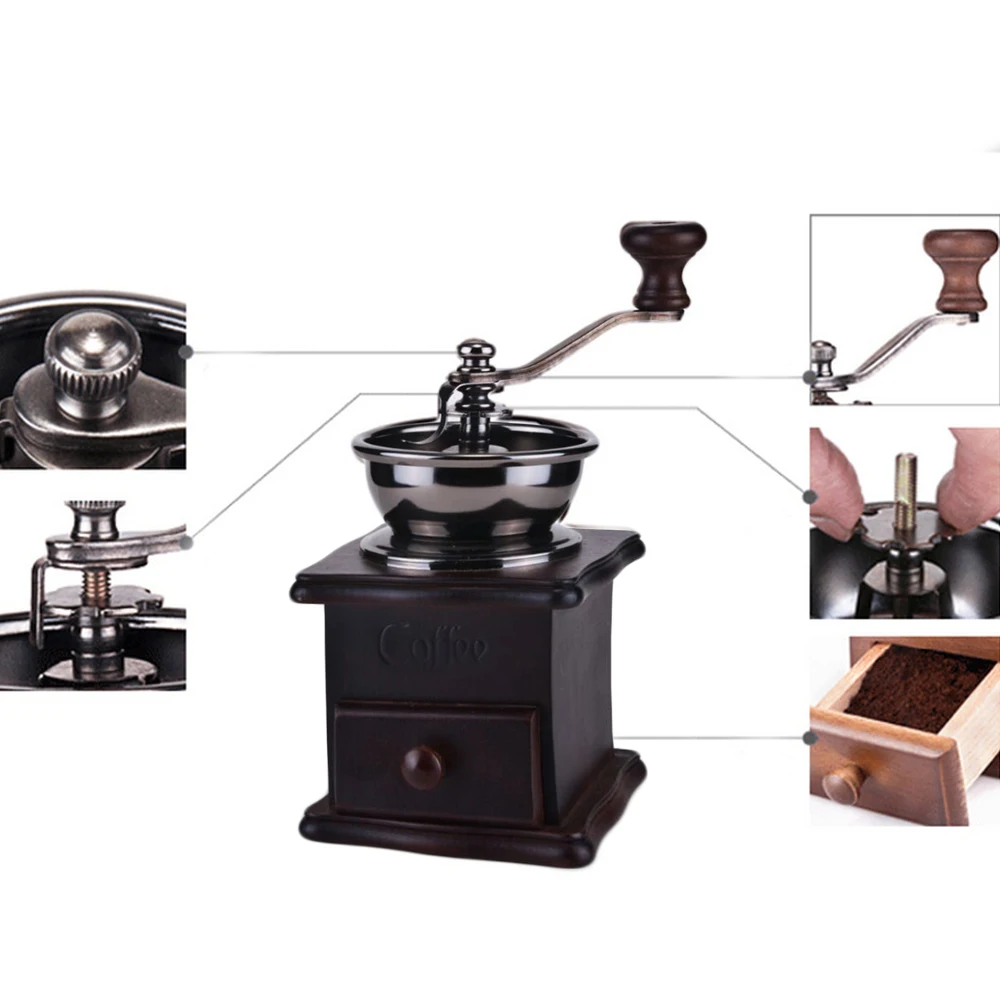 -Поместите кофейные зерна в чашу, поверните ручку и свежемолотый кофе попадает в деревянный ящик, готовый для сбора.