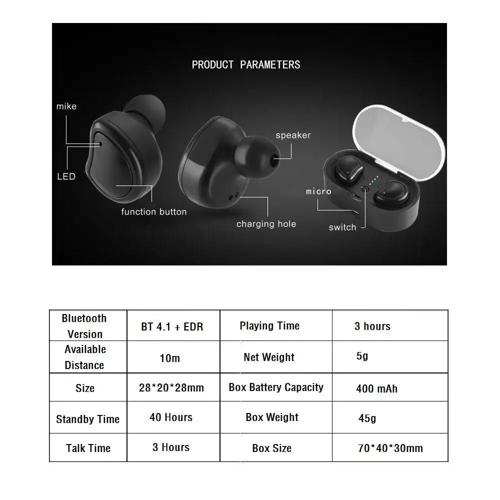 Описание: Тип товара: спортивные bluetooth-наушники Применимо: мобильный телефон, компьютер, ноутбук Цвет: черный/белый Вес брутто: 138 г, гарнитура + зарядная коробка 51 г Вес нетто: около 5 г Материал: АБС + медицинский силикон Время работы в режиме ожидания: около 50 часов Размер наушников: 24*20*24 мм Размер зарядного устройства: 75*40*32 мм Версия Bluetooth: BT4.1 + EDR Время зарядки: Зарядка 0,5 часа, использование 2 часов Батарея: 55 мА, непрерывная игра 150 минут Зарядное устройство: 400 мА, зарядка и разрядка 3 раза Посылка включает в себя: 1 пара наушников 1 х зарядное устройство Руководство пользователя-1 шт.; 1 X кабель для зарядки 1 X мешочек 4 х чехол для наушников