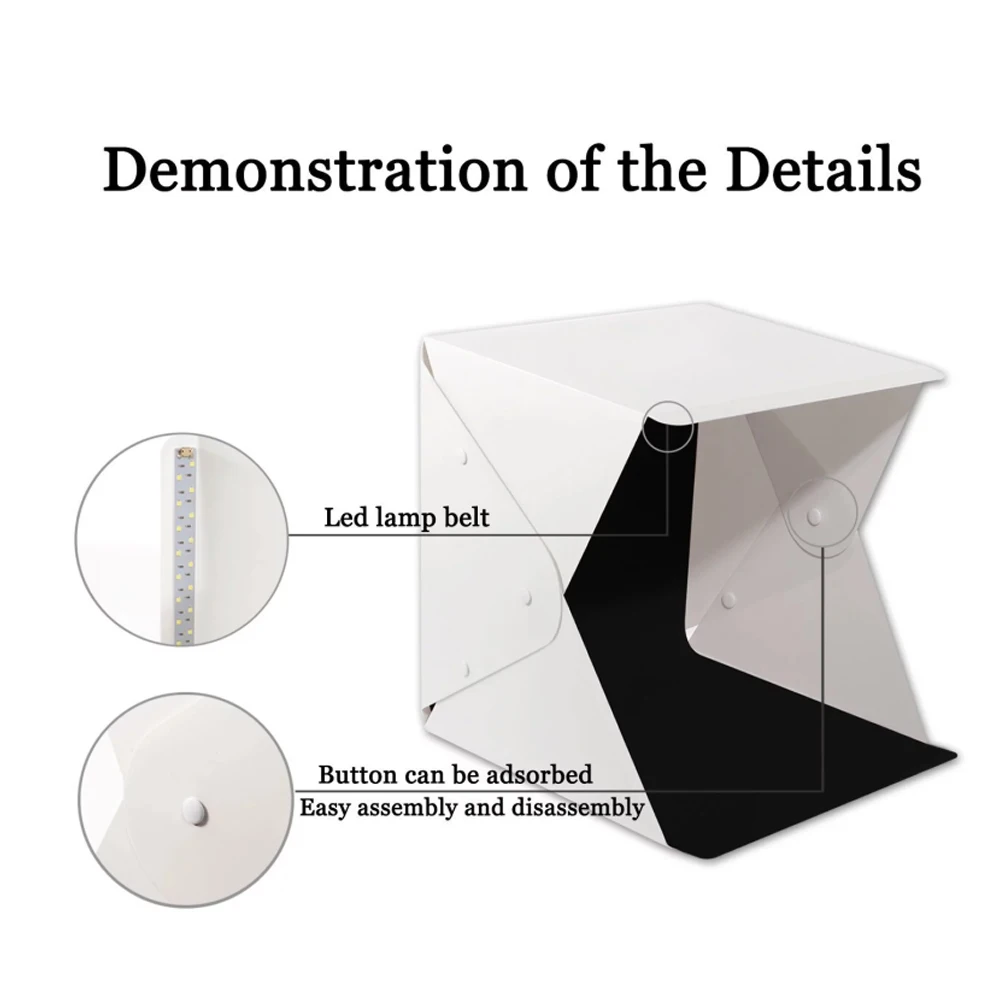 Складная лайтбокс-студия для смартфонов или DSLR, удобная для вас. Конструкция с магнитной структурой, легко собирается. Поставляется с светодиодный светильник, обеспечивает средний Светильник для вашего продукта.