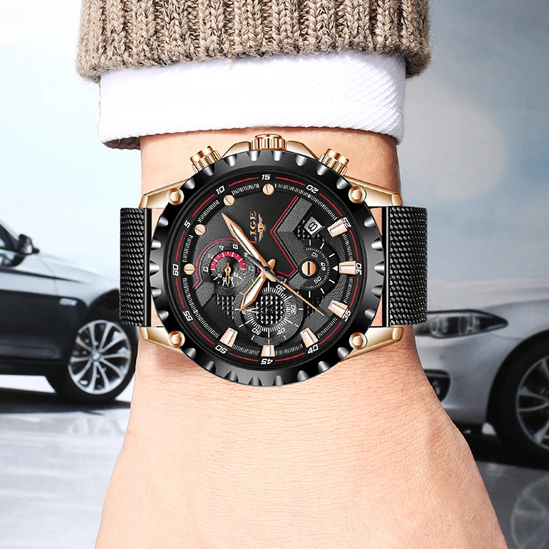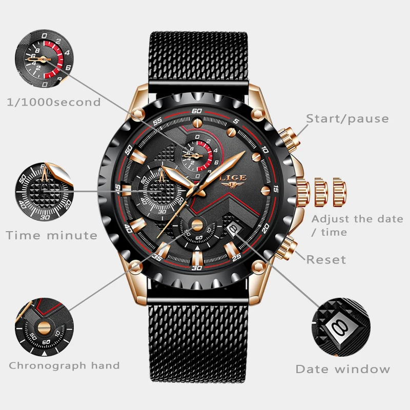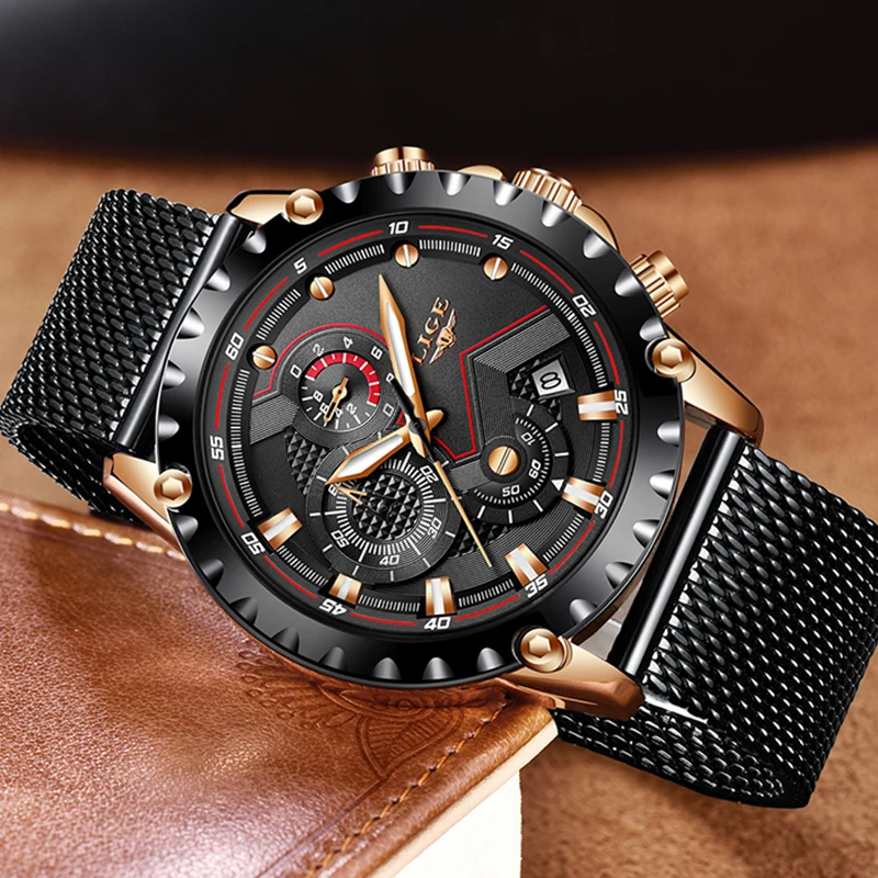 LIGE новые часы. Полностью синий сетчатый чехол с золотым покрытием. Это стильные деловые часы и часы для отдыха. С хронографом, автоматическим календарем, водонепроницаемым, ударопрочным, светящимся и другими функциями; подходит для всех случаев.