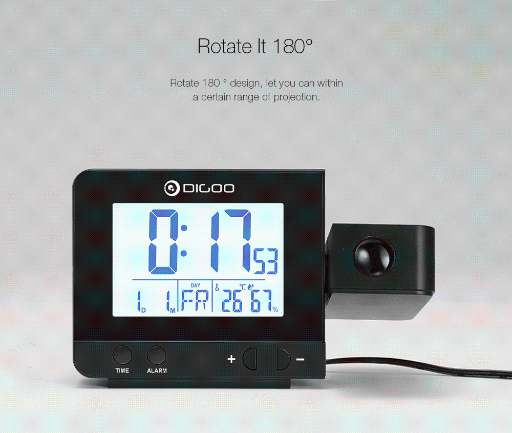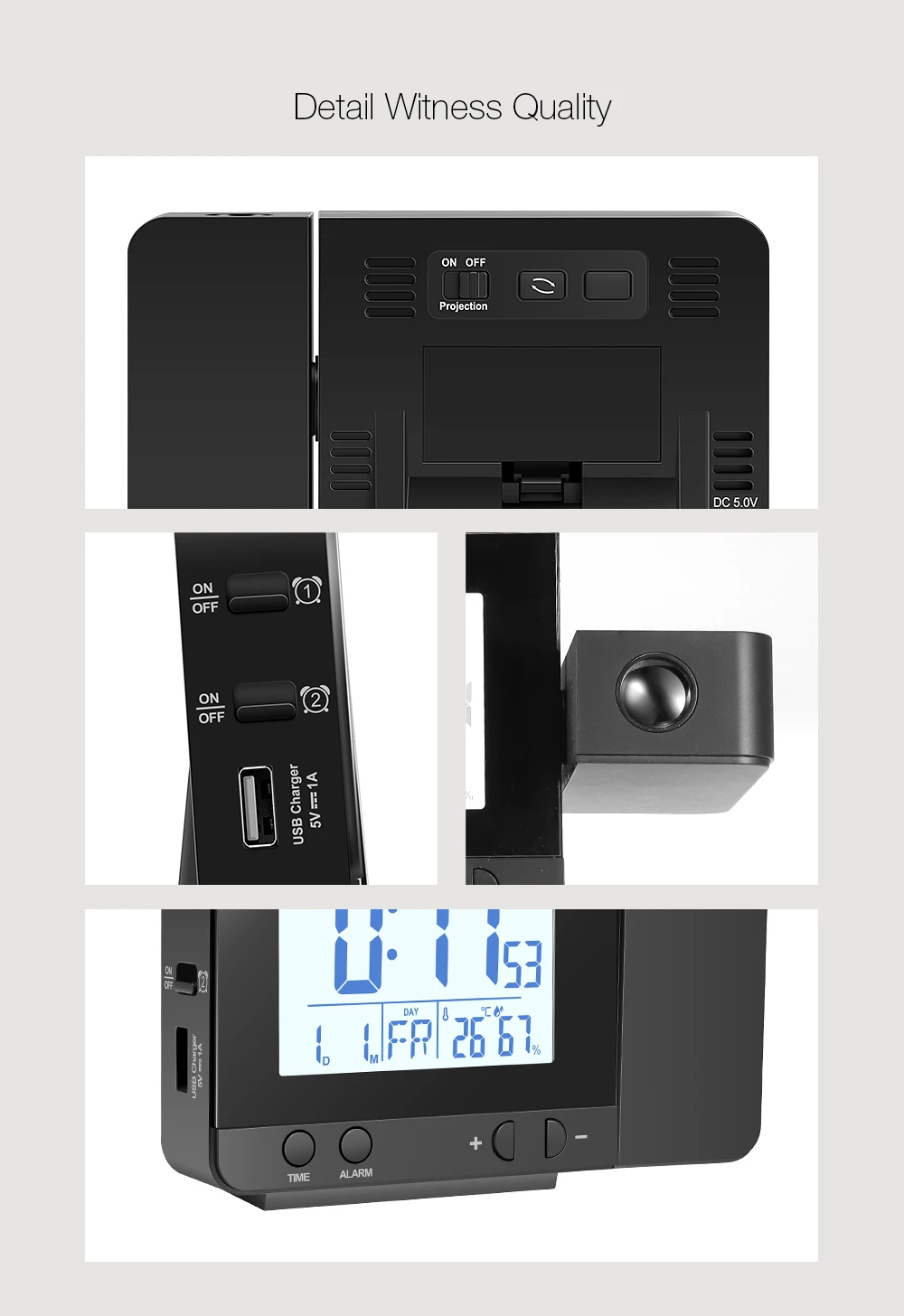 | Function | Manual Time Setting & Automatic Snooze function Warm Soft Backlight Friengly Easy Charging function HightLight & Clear Projection function (max to 9m) & Dual Daily Alarms & Adjustable Backlight Brightness Continuous Calendar Upto the year 2099 Indoor Temperature & Humidity Display |