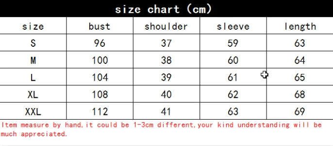 Обратите внимание: Пожалуйста, тщательно выбирайте размер. Вы можете измерить себя, сочетать с измерениями (вес, рост/бюст, плечо и рукав) на выбор. или перед оформлением заказа, вы можете связаться с нами, чтобы мы могли помочь вам выбрать правильный размер.