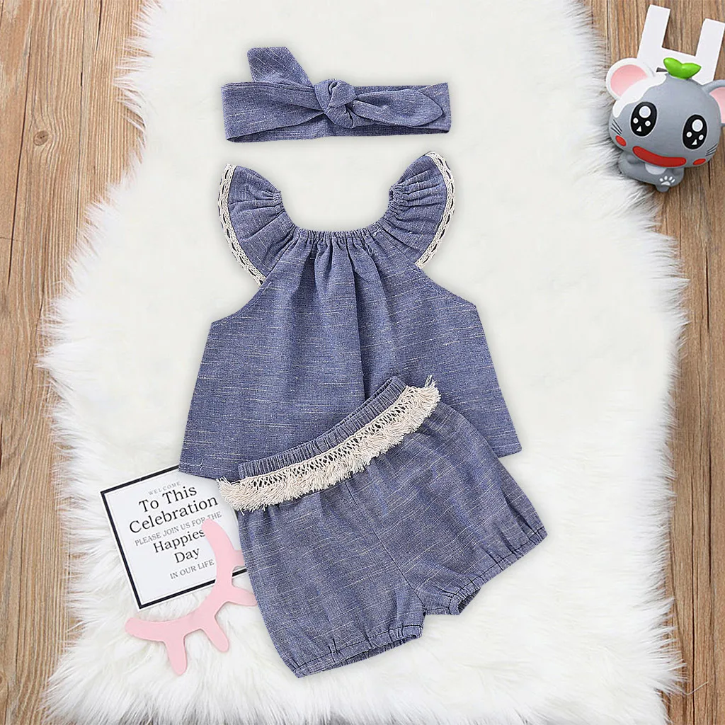 Весенне-летний хлопковый комплект из 3 предметов для новорожденных, плиссированный топ, однотонные шорты и бант, костюм с повязкой на голову для маленьких девочек, костюм для ползания