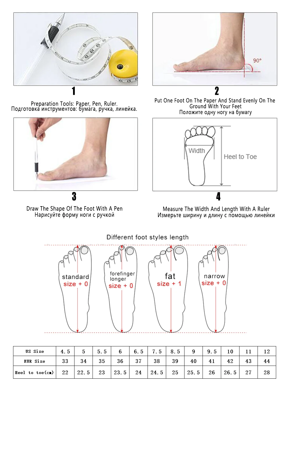 1. Обратите внимание, что из-за ручной работы размер может отличаться на 1-3 мм. Если у вас узкая и узкая стопа, пожалуйста, выберите на один размер меньше обычного; Если у вас полная и широкая стопа, пожалуйста, выберите на один размер больше обычного. 2. Наши размеры являются стандартными, пожалуйста, выберите свой обычный размер. Если у вас есть какие-либо проблемы с размером, пожалуйста, свяжитесь со мной перед размещением заказа.