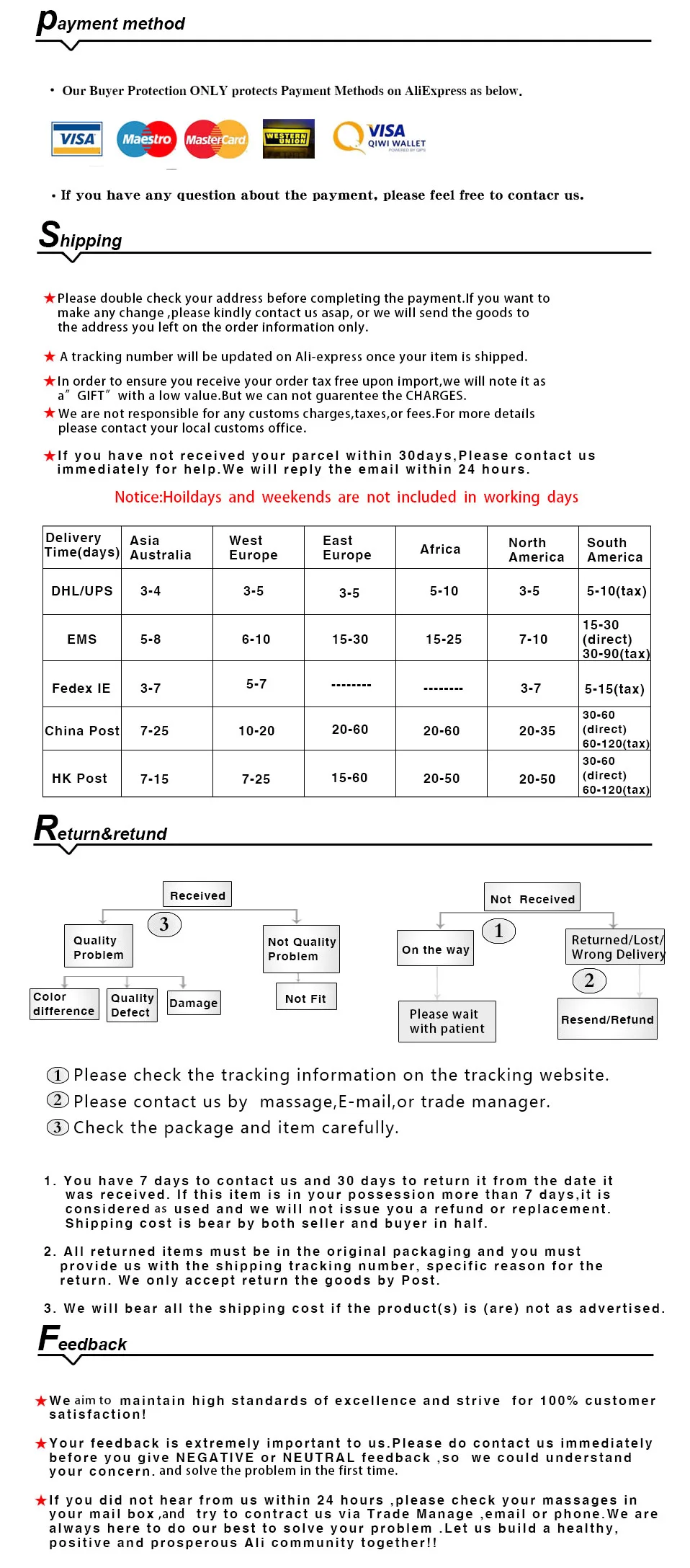 Товары будут доставлены в течение 3-7 рабочих дней после получения оплаты Пожалуйста, убедитесь, что ваш адрес доставки верен перед покупкой. Мы не несем ответственности за неправильный или недопустимый адрес доставки. Мы отправляем товар через EMS, DHL, UPS, TNT, Fedex или Private_line. Товар отправляется из Шэньчжэнь, Китай, с номером отслеживания, доходит до большинства стран в течение 3-7 дней по DHL/UPS/FeDEX/ TNT О возврате и возврате 1. У вас есть 7 дней, чтобы связаться с нами и 30 дней, чтобы вернуть его с даты получения. Если этот товар находится в вашем распоряжении более 7 дней, он считается использованным, и мы не выдадим вам возврат или замену. Стоимость доставки оплачивается как продавцом, так и покупателем пополам. 2. Все возвращенные товары должны быть в оригинальной упаковке, и вы должны предоставить нам номер отслеживания доставки, конкретную причину возврата. 3. Мы вернем вам полную выигрышную цену при получении товара в его первоначальном состоянии и упаковке со всеми компонентами и аксессуарами, после того как покупатель и продавец отменят сделку с aliexpress. Или вы можете выбрать замену. О гарантии 1. 12 месяцев ограниченной гарантии производителя на дефектные изделия (за исключением предметов, поврежденных и/или неправильно использованных после получения). Аксессуары поставляются с 3-месячной гарантией. 2. Дефектные предметы должны быть зарегистрированы и возвращены в течение гарантийного срока (и в оригинальной упаковке, если это возможно). Вы должны сообщить нам, что такое дефект, и дать нам номер вашего заказа. Мы не ремонтируем и не заменяем товары с истекшим сроком гарантии. Оставляя заказ на Aliexpress, вы соглашаетесь со всеми приведенными выше правилами! Мы оставим положительные отзывы после получения оплаты. Только для серьезных покупателей! Пожалуйста, разместите заказ, только если вы согласны со всеми условиями. Спасибо .....