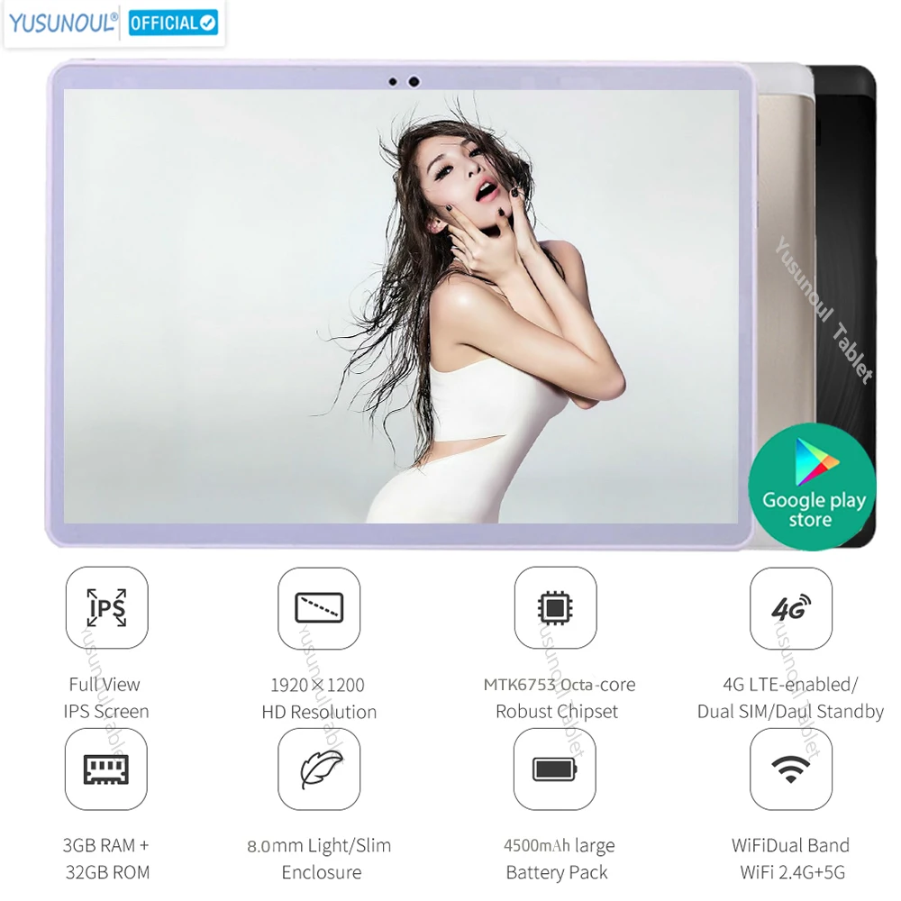 Разрешение Google Play 10 дюймов HD1920*1200Две sim-карты IPS4G FDD-LTEПланшетный ПК MT6753Восьмиядерных процессор прочная чип3 Гб оперативной памяти, Оперативная память32 Гб Встроенная память8. 0MPWifi 2,4G + 5G,4500mAh большой аккумулятор, 8,0 мм светильник/тонкий корпус + подарки