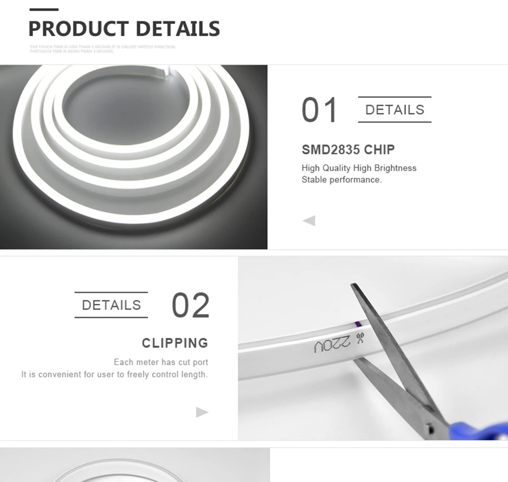 Спецификация: Тип: мягкие гибсветодиодный светодиодные неоновые гирлянды Входное напряжение: AC220V-240V Тип штепсельной вилки: штепсельная вилка европейского стандарта Светодиодный Дов: SMD2835 Количество СВЕТОДИОДНЫЙ: 120 светодиодный с/метр Цвет светильник: теплый белый/красный/зеленый/синий/розовый Угол свечения: 180 градусов Длина полосы: 1 м-100 м Ширина полосок: 16 мм Мощность: 7 Вт/м Водонепроницаемость: Водонепроницаемость IP68 Режущий блок: 1 м Угол свечения: 180 градусов Длительный срок службы:> 50000 часов Особенность: Низкое энергопотребление, супер-яркий, но работает при низкой температуре Светильник свет рассеивается и полностью гладкий, светящийся очень ровный Светодиодный Дов: высококачественный светодиод 2835 SMD, высокая интенсивность и надежность