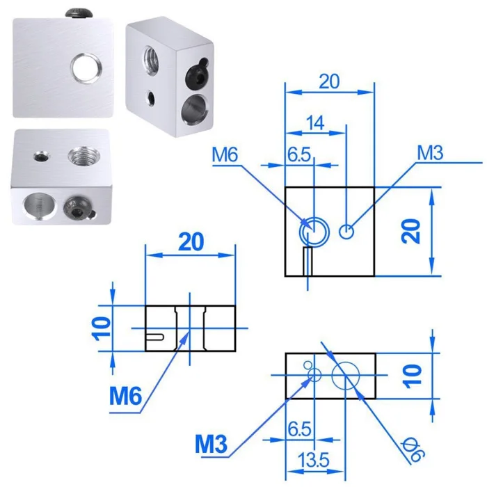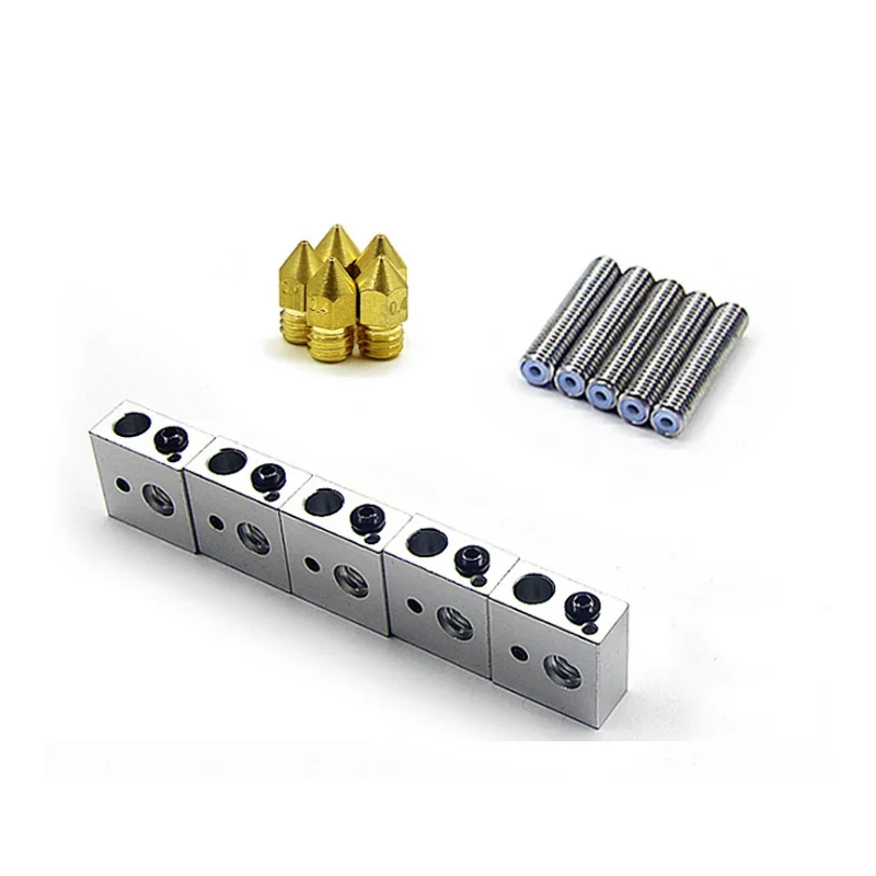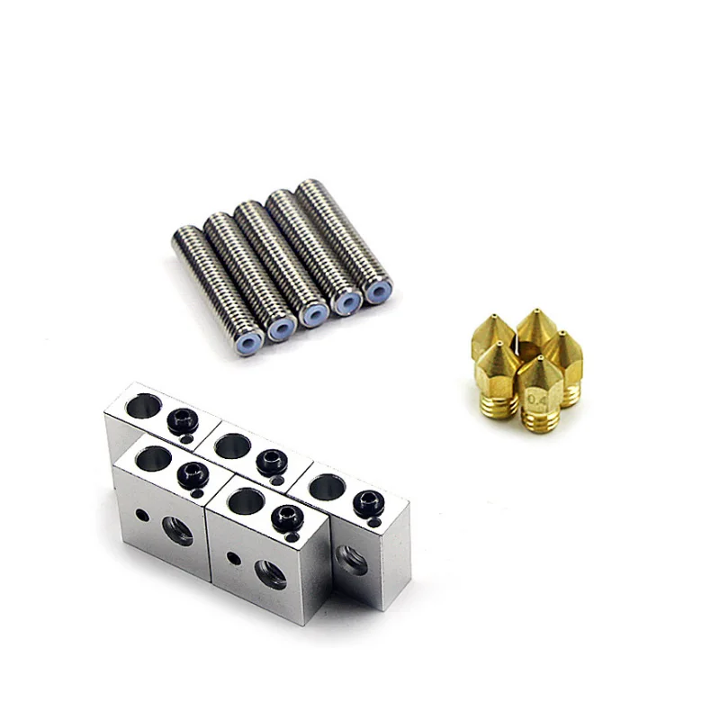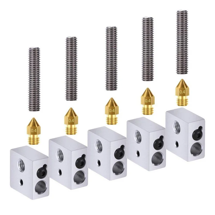 Quanlity:1 set (5pcs 1.75mm Nozzle Inputting Tube,5pcs 3D Printer 0.4mm Extruder Brass Nozzle Print Head,5pcs Heater Blocks Hotend+2pcs Wrench)