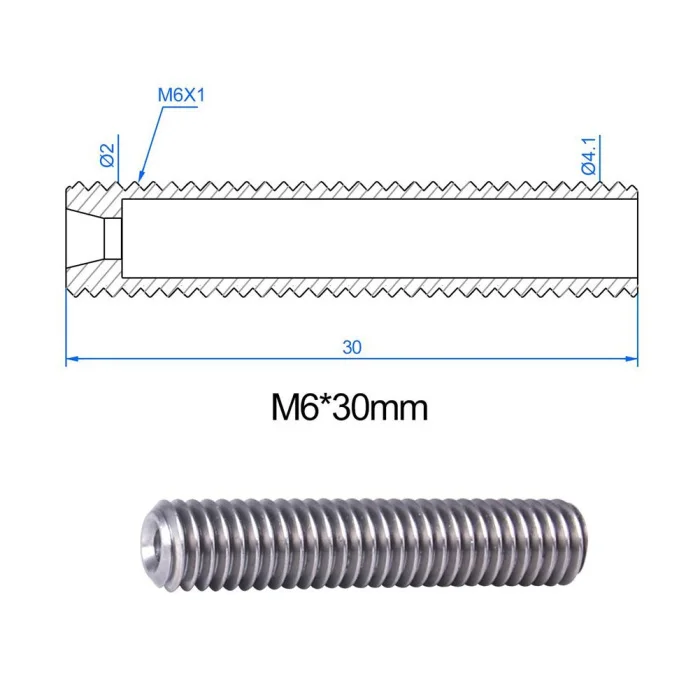 Nozzle Throat: Outer Thread - M6; Inner Diameter - 2mm; Length - 30mm; Filament Diameter - 1.75mm; Material - Stainless Steel.