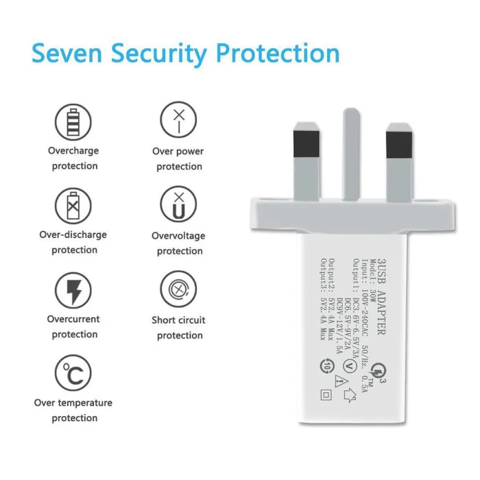 3. Надежное качество с премиум-дизайном: Этот usb-адаптер имеет высокозащитную премиальную схему, которая может одновременно заряжать 3 usb-устройства. Обеспечивает полную защиту от перегрузки по току и напряжению, перегрузки и короткого замыкания для безопасности.