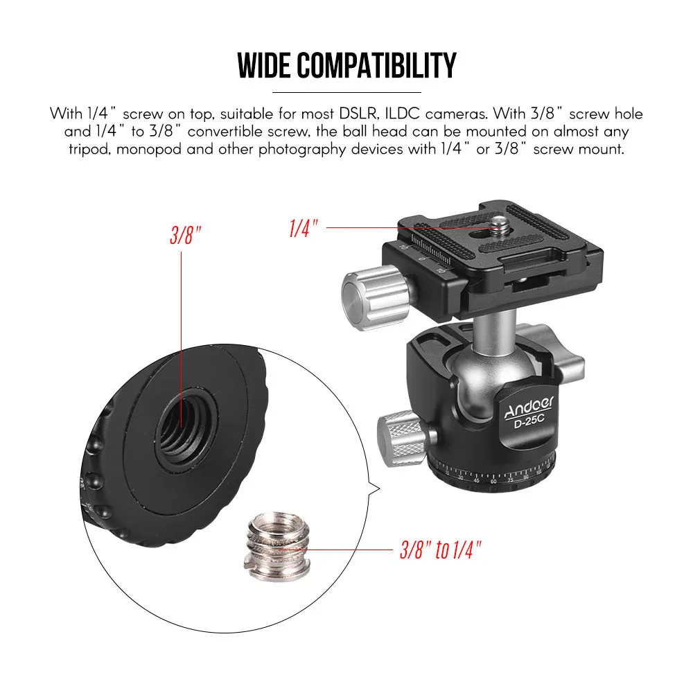 Широкий Совместимость:Максимальная грузоподъемность до 10 кг/22 фунта. С винтом 1/4 дюйма, подходит для большинства камер DSLR, ILDC. С резьбовым отверстием 3/8 дюйма и конвертируемым винтом от 1/4 до 3/8 дюйма, шаровая Головка может быть установлена практически на любом штативе, моноподе и других фотографических устройствах с винтовым креплением 1/4 или 3/8 дюйма.