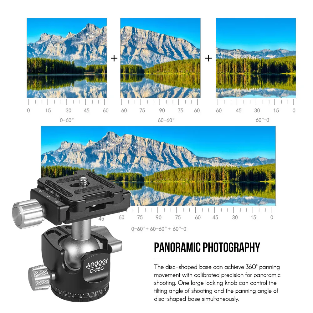 Панорамные фотографии:Основание в форме диска обеспечивает вращение на 360 ° С откалиброванной точностью для панорамной съемки. Одна большая ручка блокировки может контролировать наклон угла съемки, другая маленькая ручка блокировки для регулировки панорамного основания.