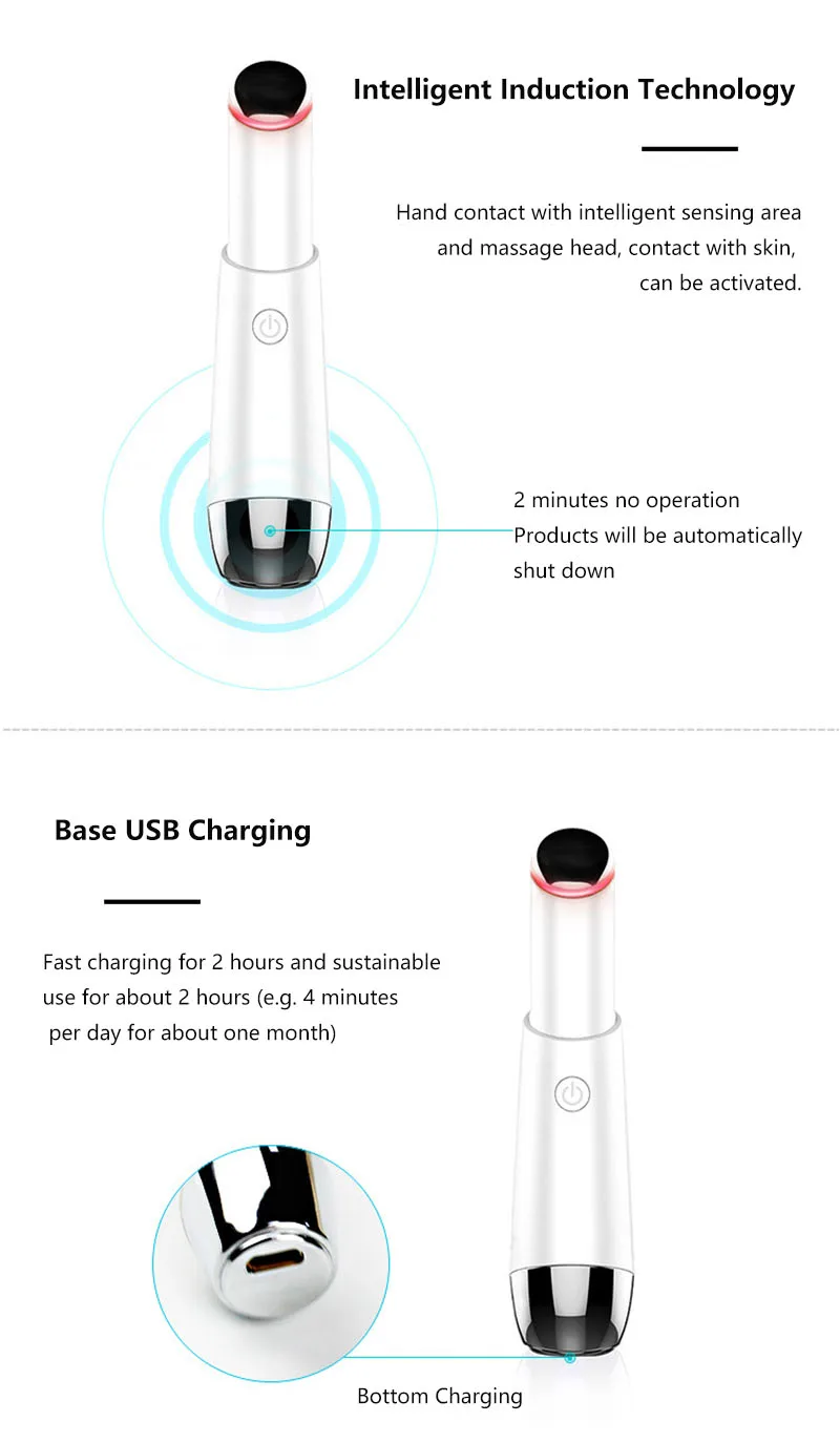 Особенности: 1. 42 ℃ ± 3 ℃ постоянная температура горячего компресса и специально разработанного ионного свинца в технологии, может способствовать поглощению питания продуктов по уходу за кожей. 2. 12000 раз/мин высокочастотный микро-вибрационный массаж, может активировать клетки кожи и восстановления кожи эластичное волокно. 3. Фотонная терапия, она может доставить красный и синий светильник. Красный светильник способствует циркуляции, поднятию глаз и омолаживанию, синий светильник снимает усталость, подтягивает кожу и восстанавливает эластичность. 4. Интеллектуальный Индуктивный запуск, когда-то коснувшись, он вибрирует. (В состоянии ботинка, удерживайте руки в области зондирования хвоста, в то же время Массажная головка находится в контакте с кожей) 5. Эффективно снимает усталость глаз, удаляет темные круги, мешки для глаз, вороньи ноги, ослабляет линии губ и развивает более полные губы. 6. Он автоматически отключится через 2 минуты без работы. 7. Наклонная металлическая Массажная головка адаптируется к контуру глаз и губ. 8. Дизайн USB для зарядки, маленький и изысканный внешний вид, прост в использовании и переноске, вы можете использовать его в любом месте и в любое время. 9. Только для взрослых и подходит как для мужчин, так и для женщин. Параметры: Материал: АБС-пластик + Поликарбонат Напряжение зарядки: 5 В Рабочее напряжение: 3,7 V Рабочий ток: 20-200mA Мощность: ≤ 1 Вт Частота вибрации: 12000 ± 1500 об/мин Температура: 42 ℃ ± 3 ℃ Время зарядки: 2 часа Время использования: 2 часа Цвет: белого и розового цвета Размеры: 2,3*11,9 см (Д * В) Вес: 53 г Посылка Содержание: 1 x массажер для глаз 1 х USB кабель для зарядки