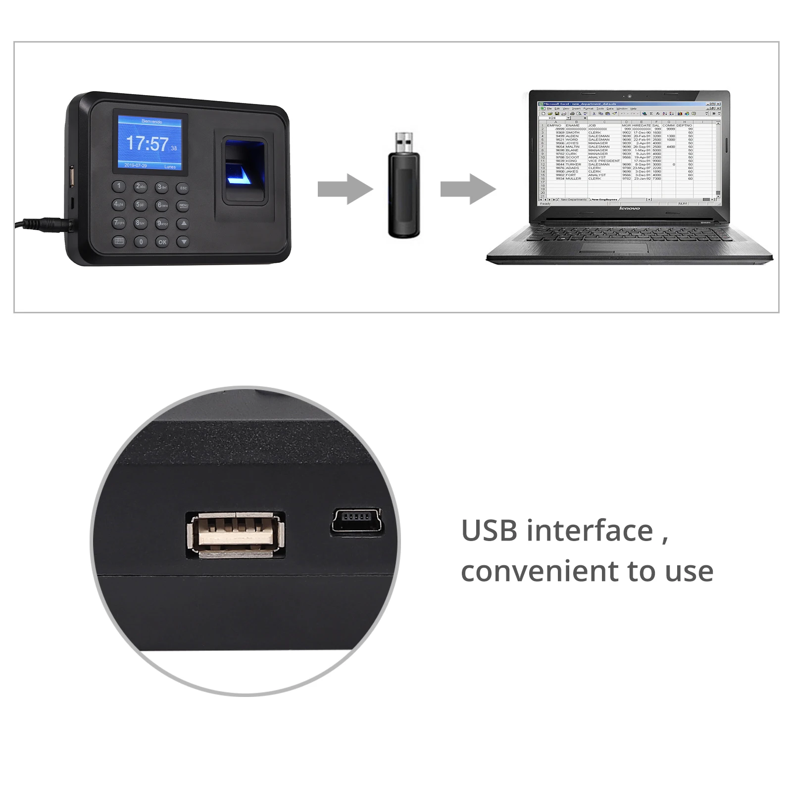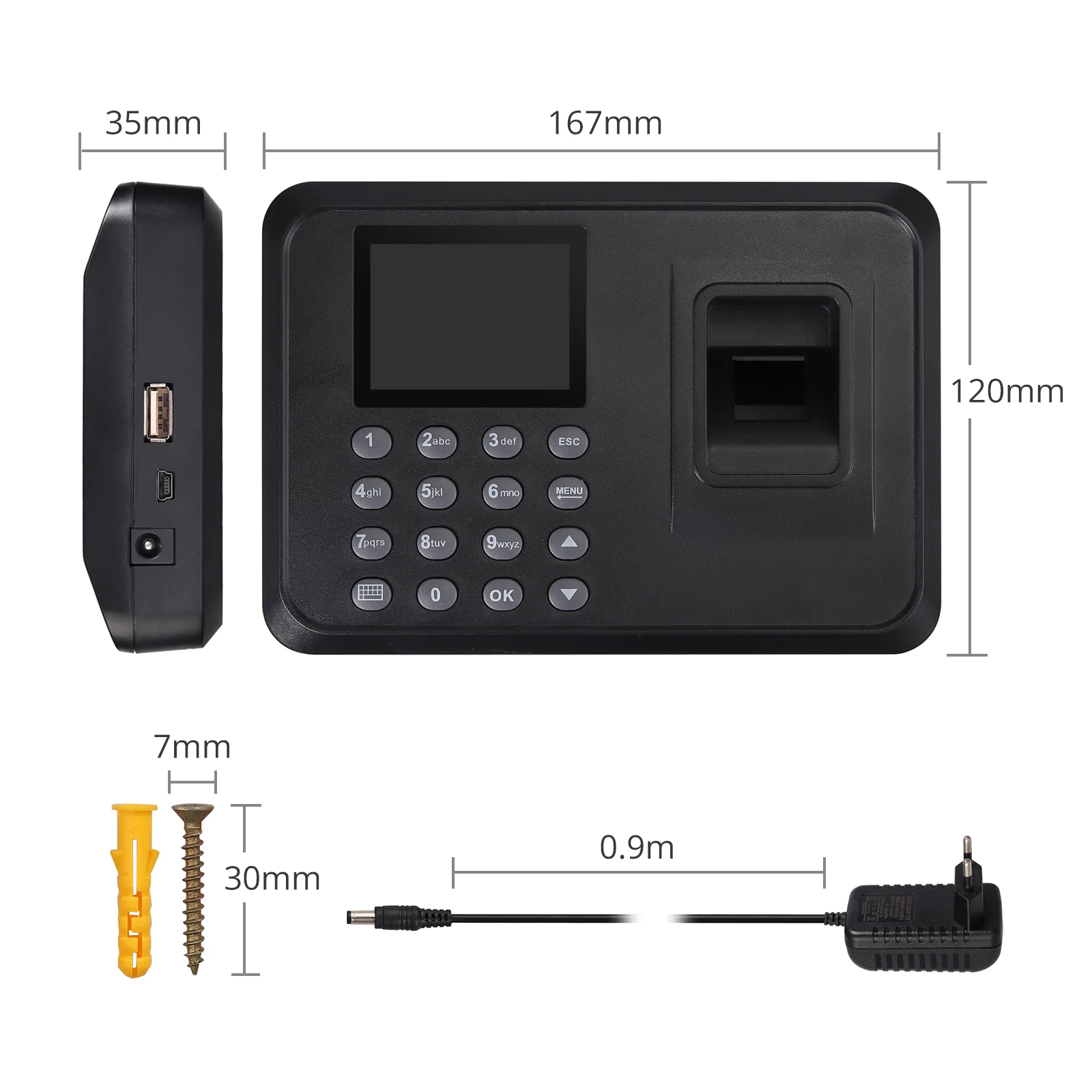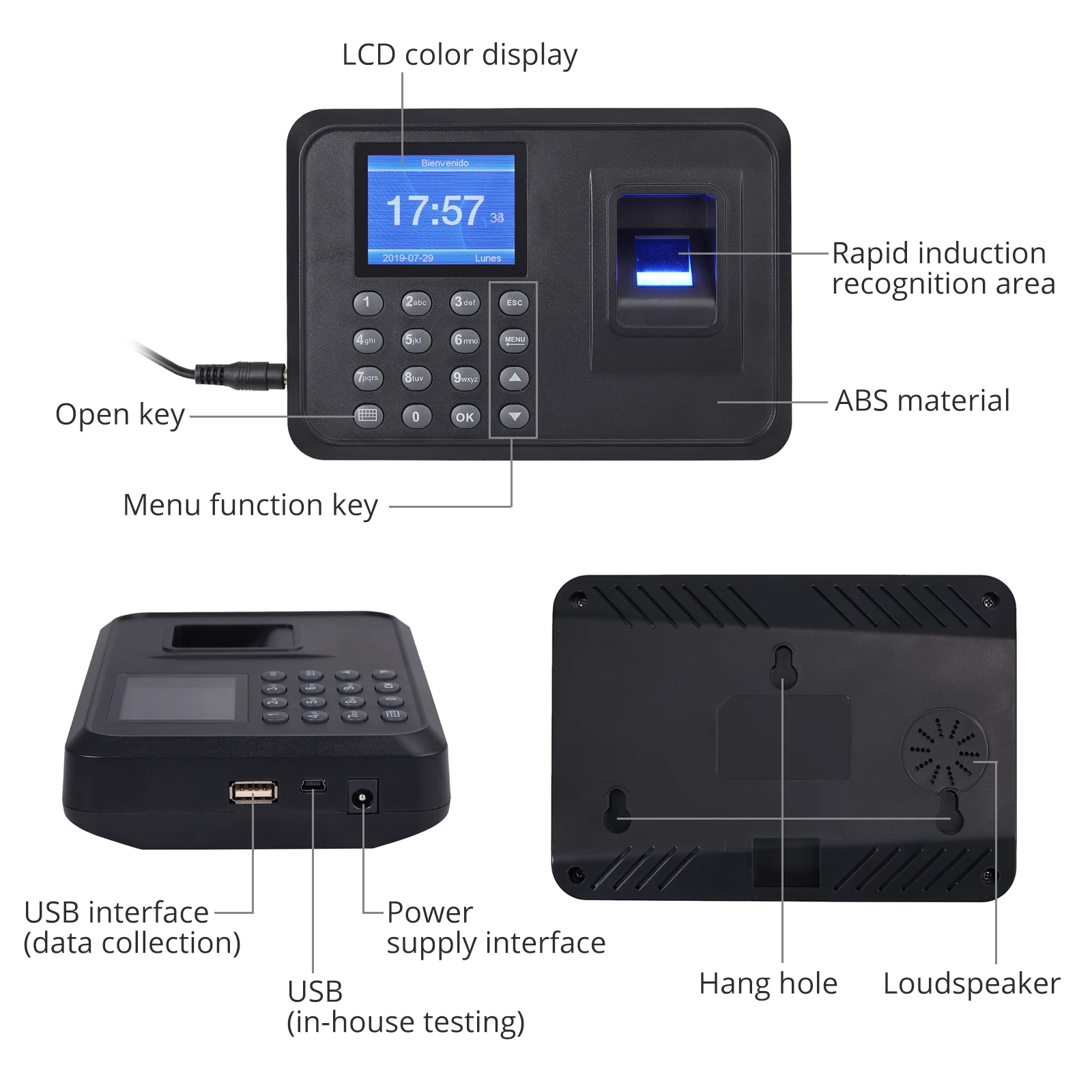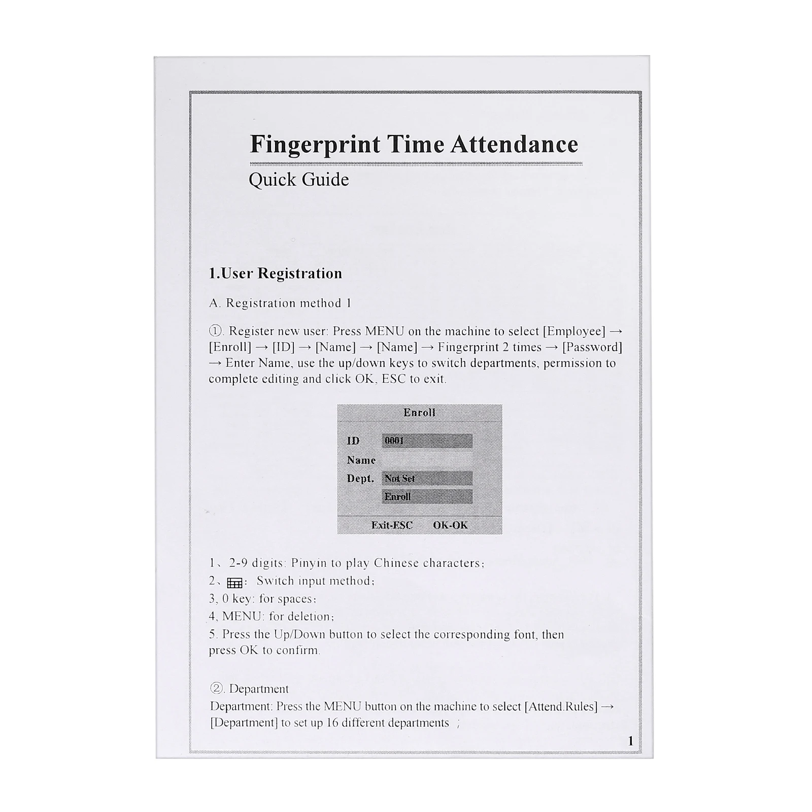 Особенности: Поддержка английского, испанского, португальский, вьетнамский, китайский. Испанский язык инструкция по эксплуатации. 100000 лог емкости; 1000 отпечатков пальцев capacity.2.4-дюймовый TFT ЖК-экран, USB интерфейс, удобный в использовании. Нет необходимости в программном обеспечении, автоматически выводит отчеты о посещаемости. Поддерживает голосовую функцию, быструю идентификацию и т. д. принятие энергосберегающего датчика отпечатков пальцев и функции управления питанием. Облегчает отслеживание времени, уменьшает нагрузку на управление. Подходит для сотрудников, посещающих офис, завод, отель, школу и т. д. Технические характеристики: Цвет: черный Материал: АБС-пластик, Экран: 2,4 "TFT ЖК-дисплей Экран отпечатков пальцев Ёмкость: 1000 журнала Ёмкость: 100000 Разрешение: 500 Точек на дюйм Процессор: 32 бит Процессор отпечатков пальцев Сенсор: энергосберегающий датчик отпечатков пальцев интерфейс: режим идентификации USB: Отпечатков пальцев + пароль запрос показателя: в наличии Язык: упрощенный китайский, традиционный китайский, английский, польский, португальский, испанский, ФПП: ≤ 1% далеко: ≤ 0.0001% Скорость: ≤ 0,8 s Напряжение: DC 5В/1A товар Размеры: 17*12*3 см/6,69*4,72 * 1.18in пункт Вес: 236 г посылка Размеры: 28*14,5*4,8 см/11,02*5,71 * 1.89in посылка Вес: 467g (/467471g) посылка списка: 1 * учета рабочего времени по отпечаткам пальцев 1 * Мощность адаптер (ЕС) () 3 * крепежные винты 3 * расширительные трубки 2 * Руководство пользователя (английский Español)
