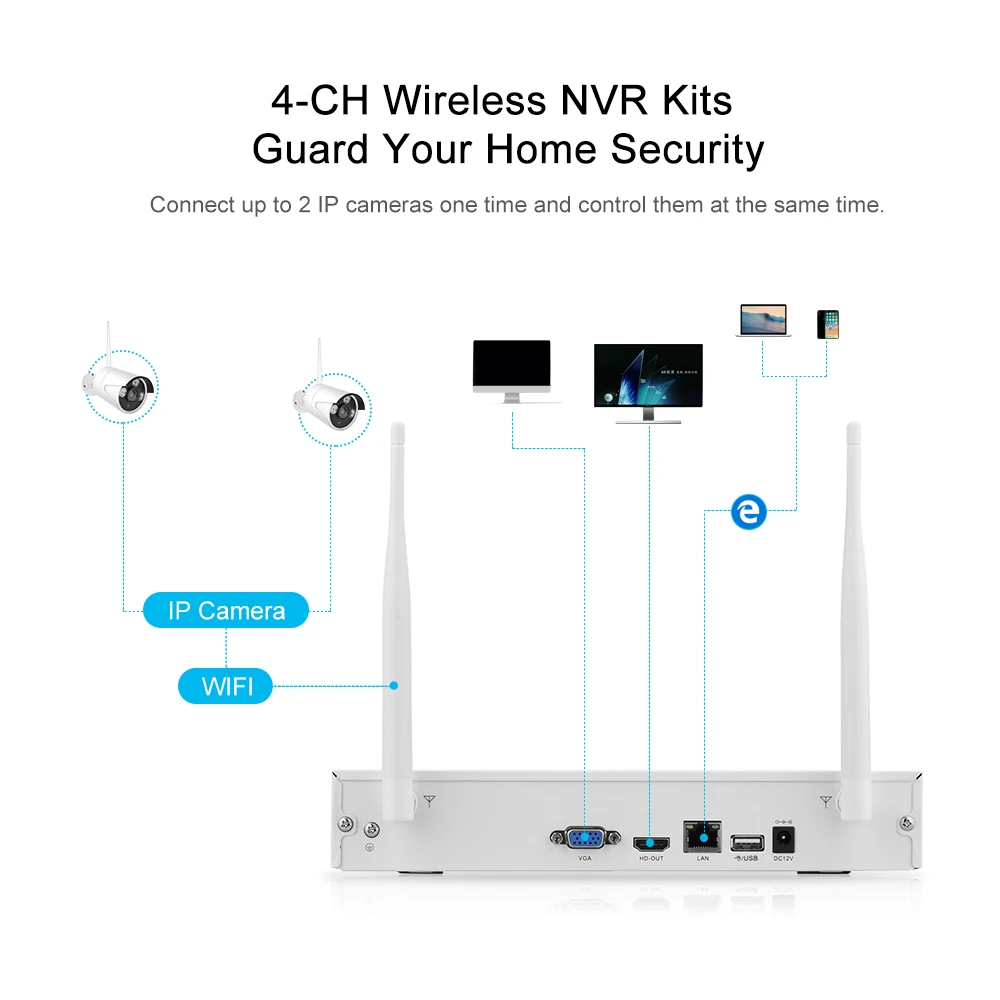 The NVR in this WiFi Wireless NVR KIT is 8 channel 1080P 2.0MP NVR ,support up to 8 pcs 1080P WIFI cameras.