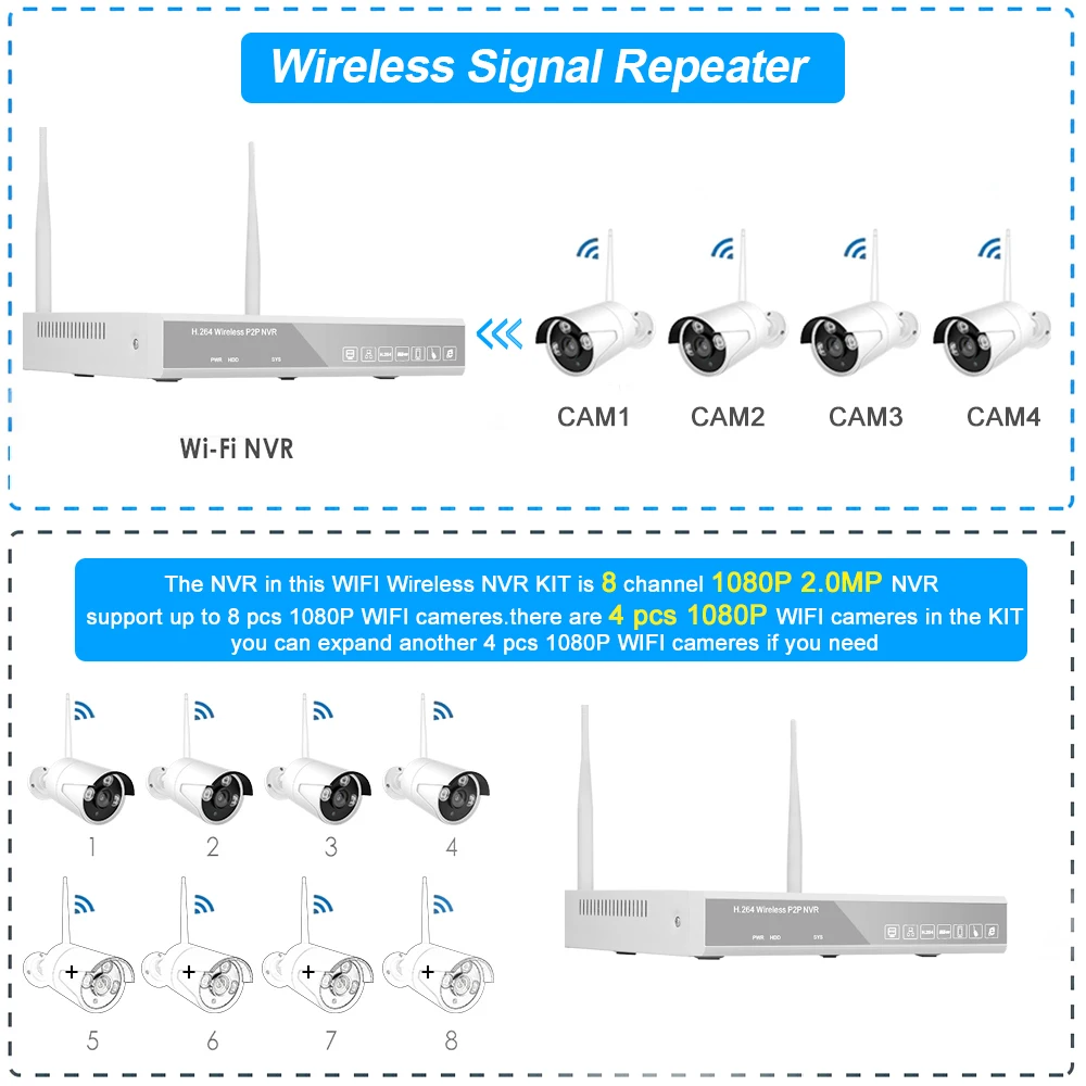 There are 4 pcs 1080P WIFI cameras in the KIT,you can expand another 4 pcs 1080P WIFI cameras if you need.