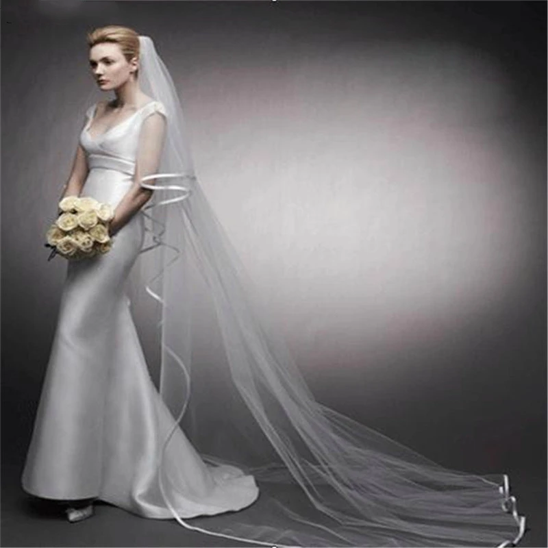 Настоящая фотография белая/слоновая кость двухслойная свадебная вуаль 3 м с лентой по краю Мантилья свадебная вуаль невесты Свадебные аксессуары Veu De Noiva