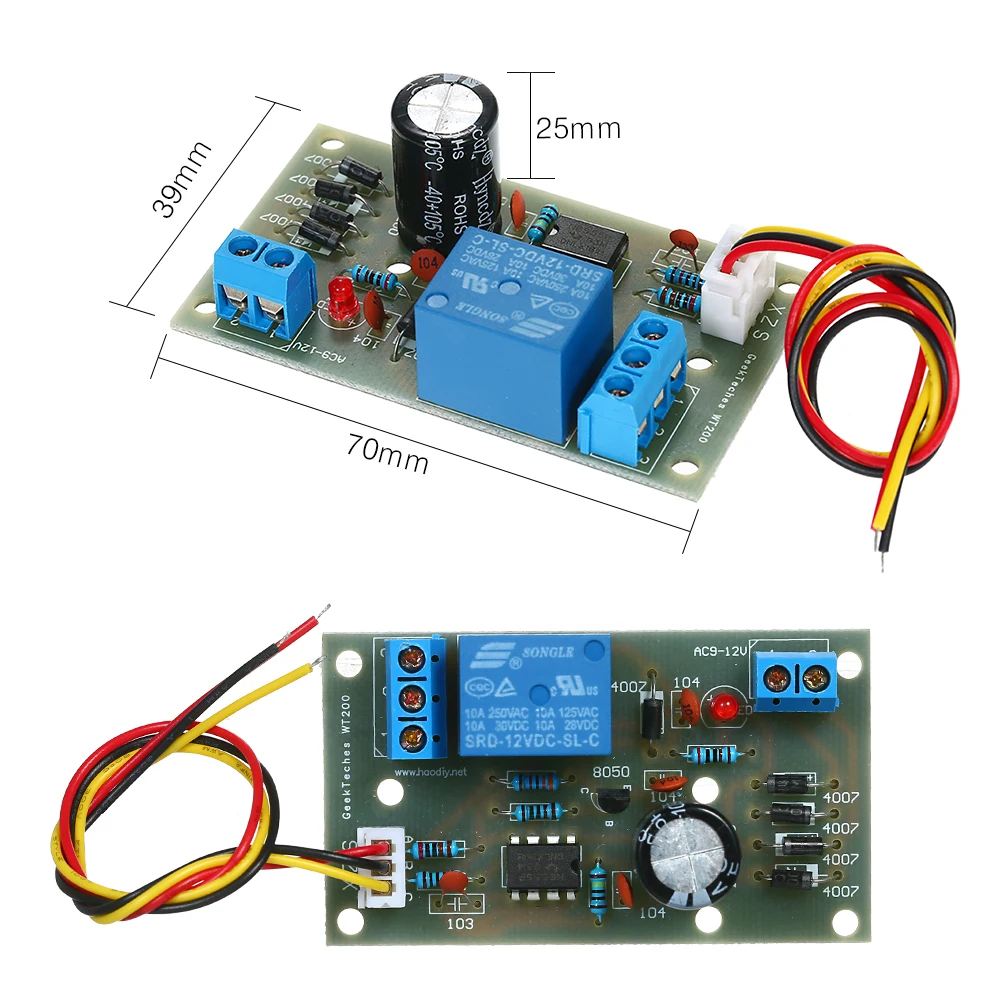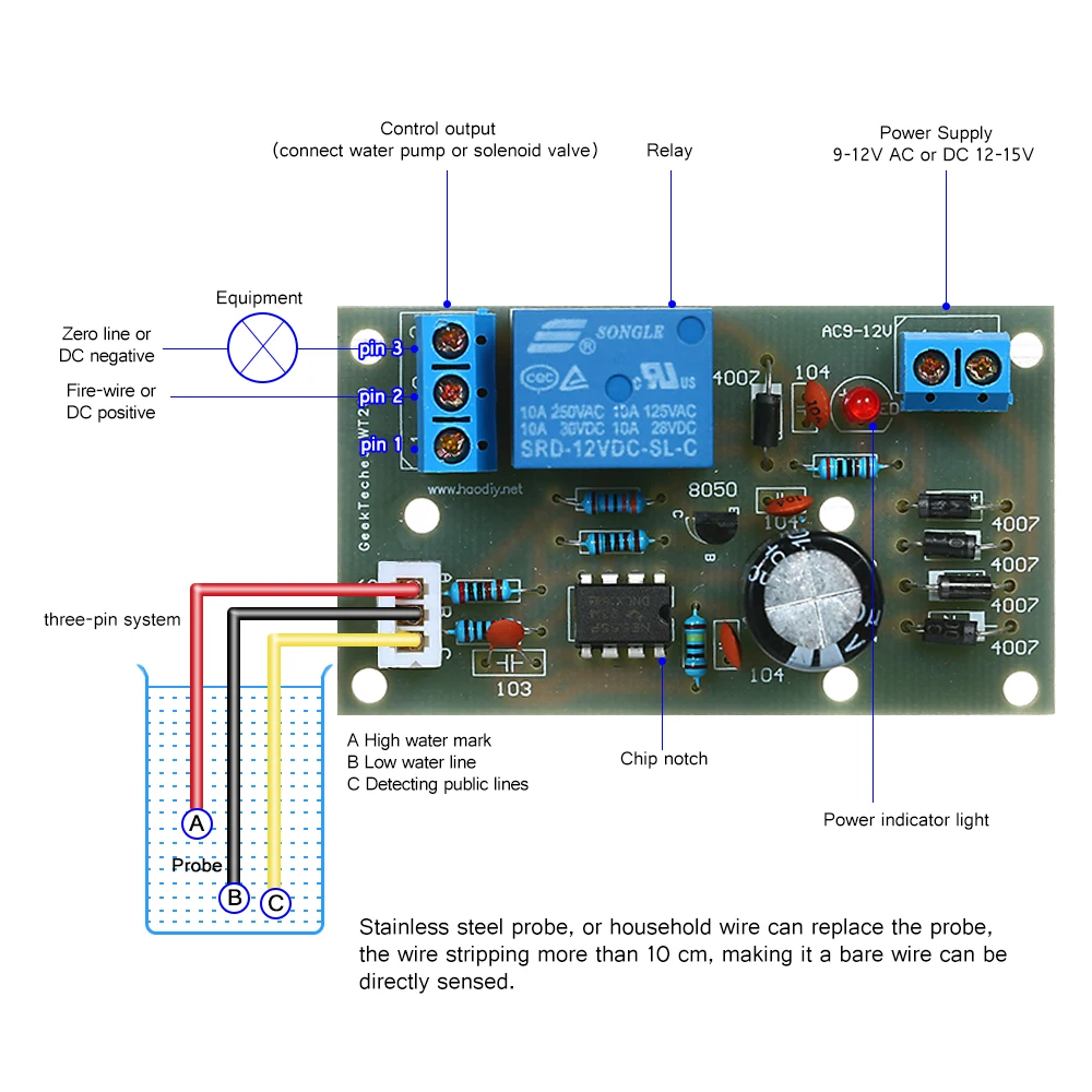 Probe production and sensitivity: This product requires stainless steel probe, or household wire can replace the probe, the wire stripping more than 20 cm, making it a bare wire can be directly sensed (many people react: the relay is not released, the water is full But keep pumping. Prove the probe is too small, low sensitivity can not be sensed, please make the probe area bigger, increase the contact with water, reduce the water resistance, the greater the sensitivity of the probe to do the higher).