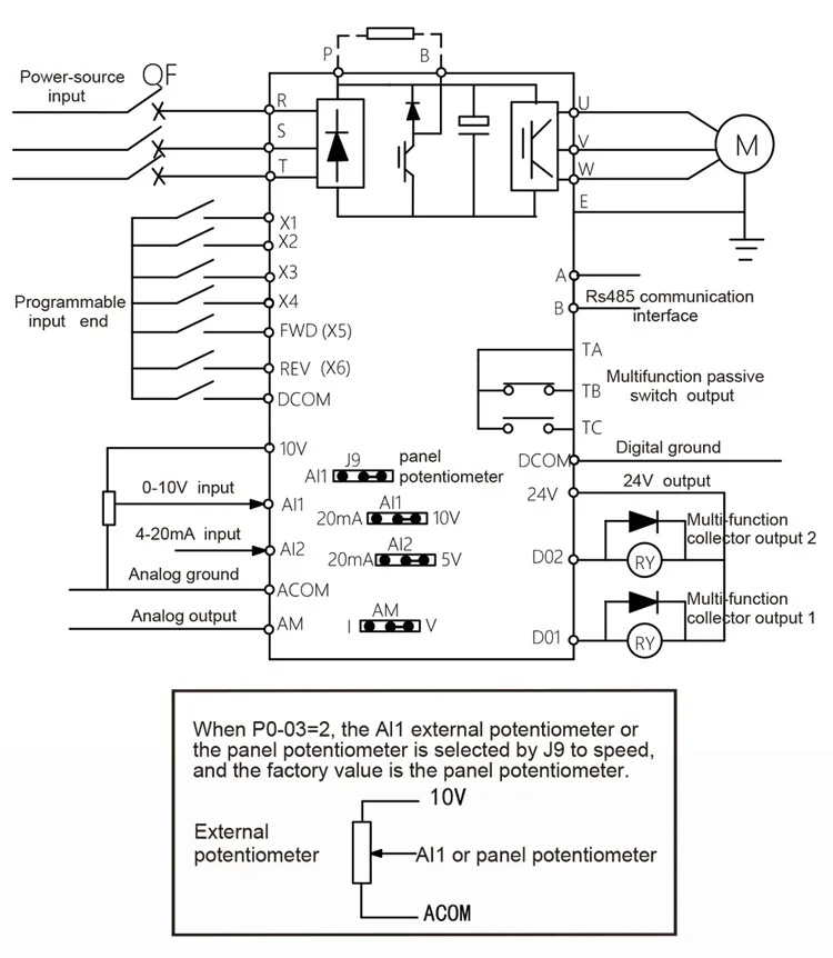 Дополнительное Примечание: R, S, T являются входными клеммами трехфазного источника питания преобразователя частоты.