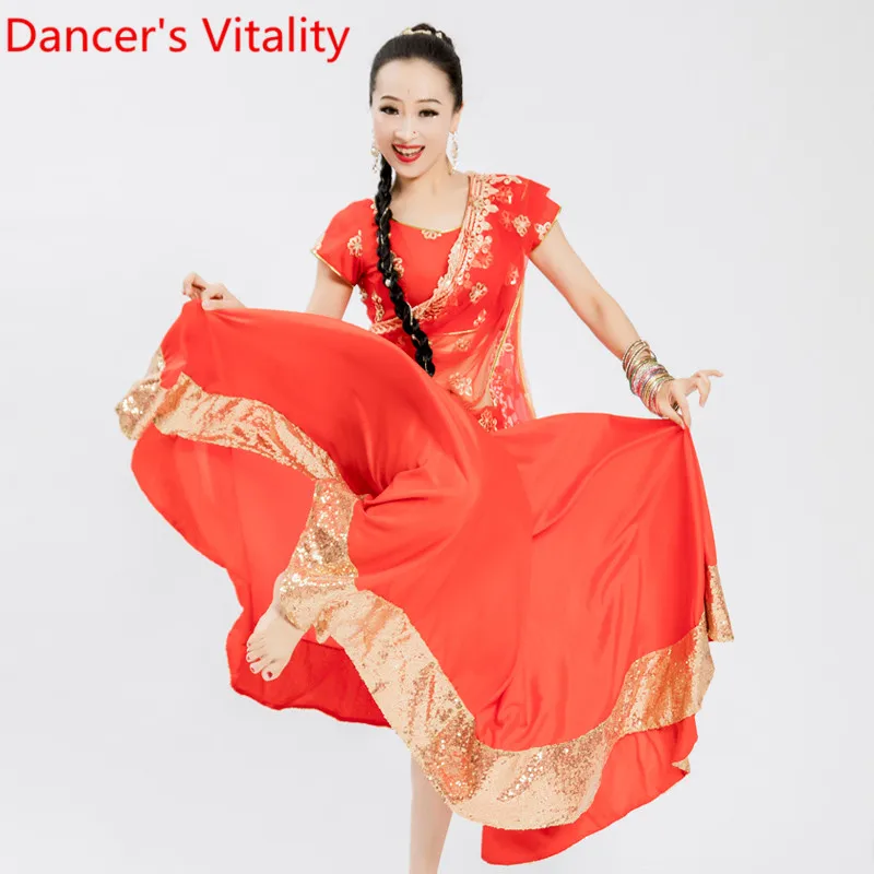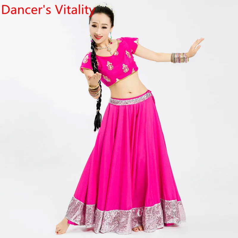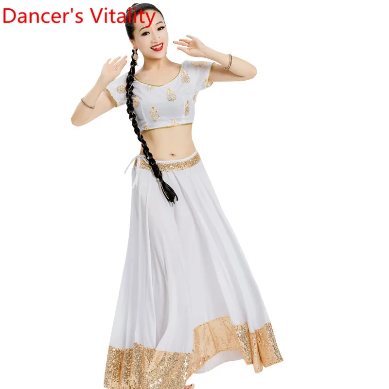 Индийский танец вышитый Топ перспективная вуаль юбка 3 шт. комплект сценическая одежда сари живота восточные танцы представление костюм сценическая одежда
