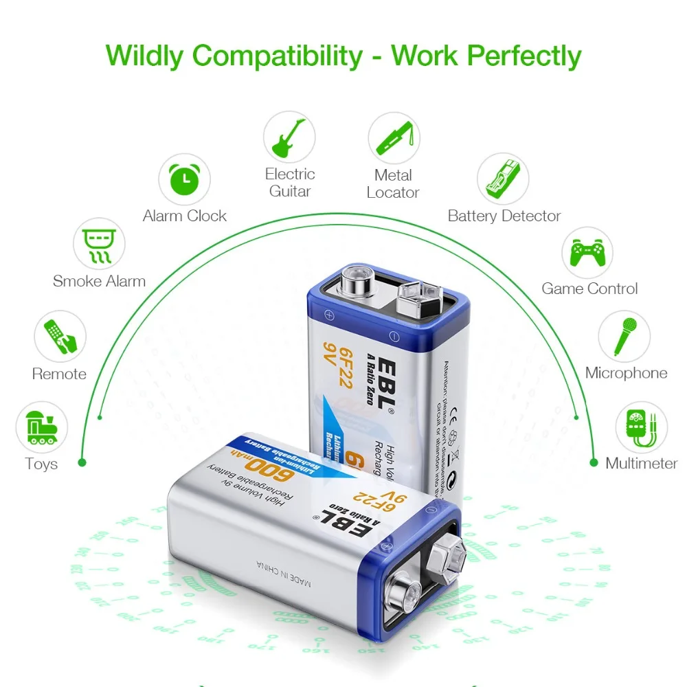 Купить EBL литий-ионная аккумуляторная батарея 600 mAh 8 слотов 9 Вольт зарядное устройство