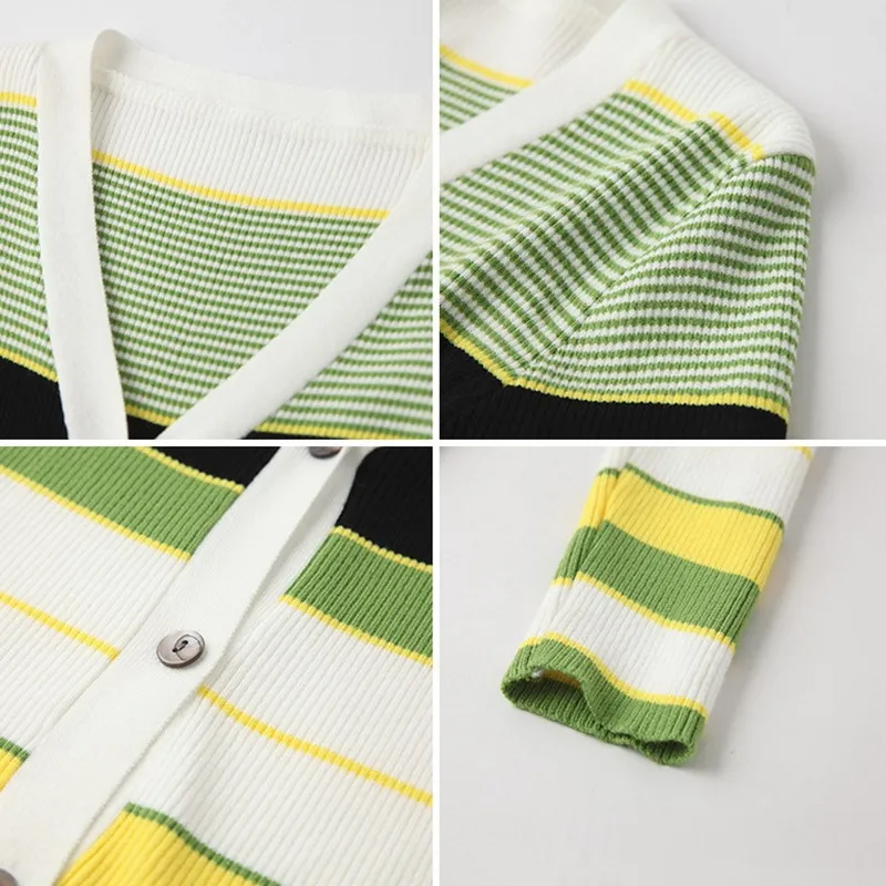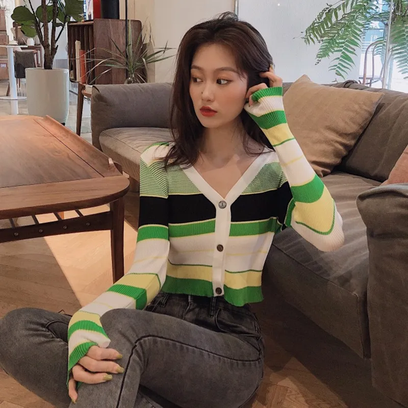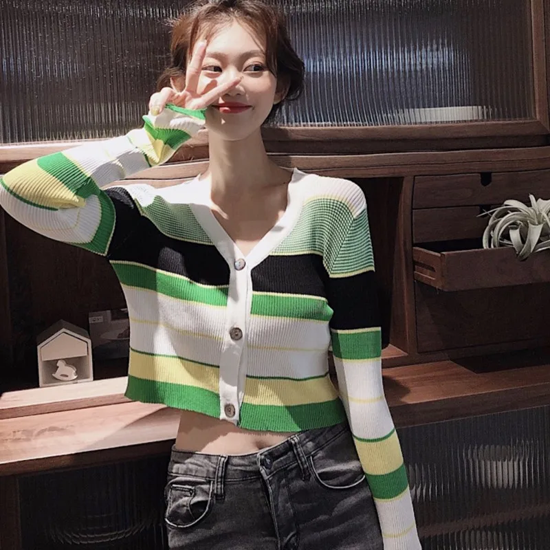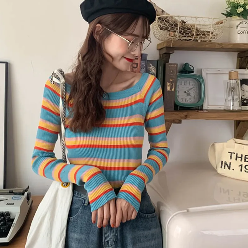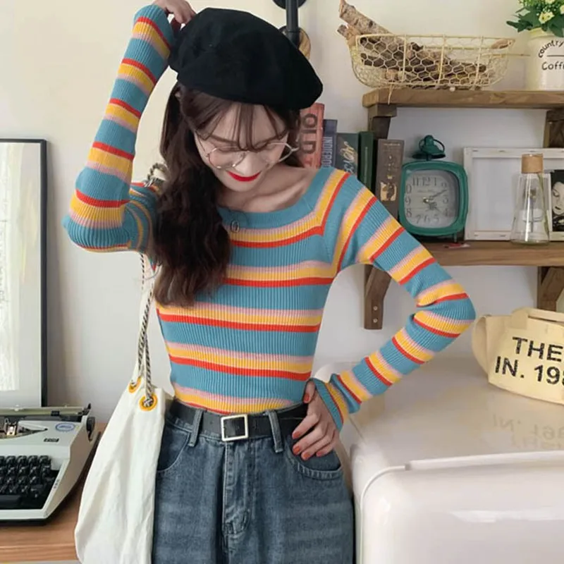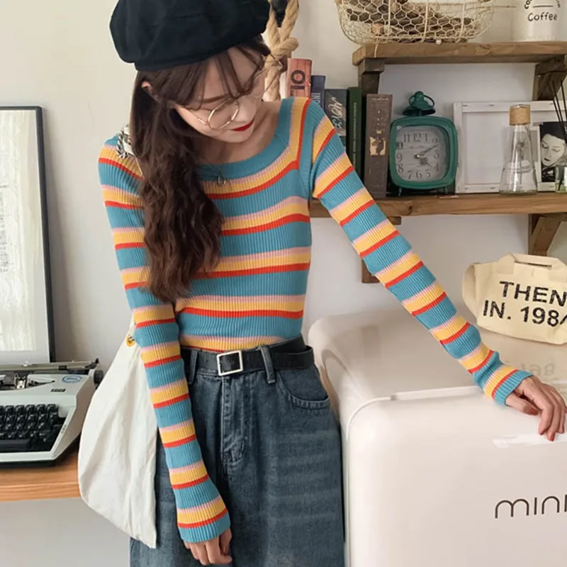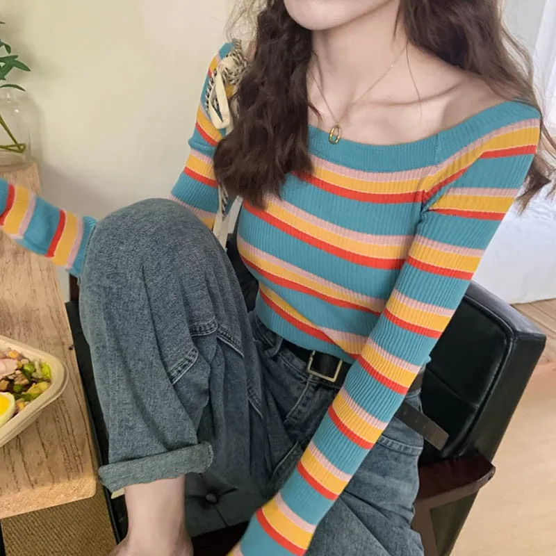 Отзывы о Женский трикотажный свитер в радужную полоску с длинным рукавом Женская одежда